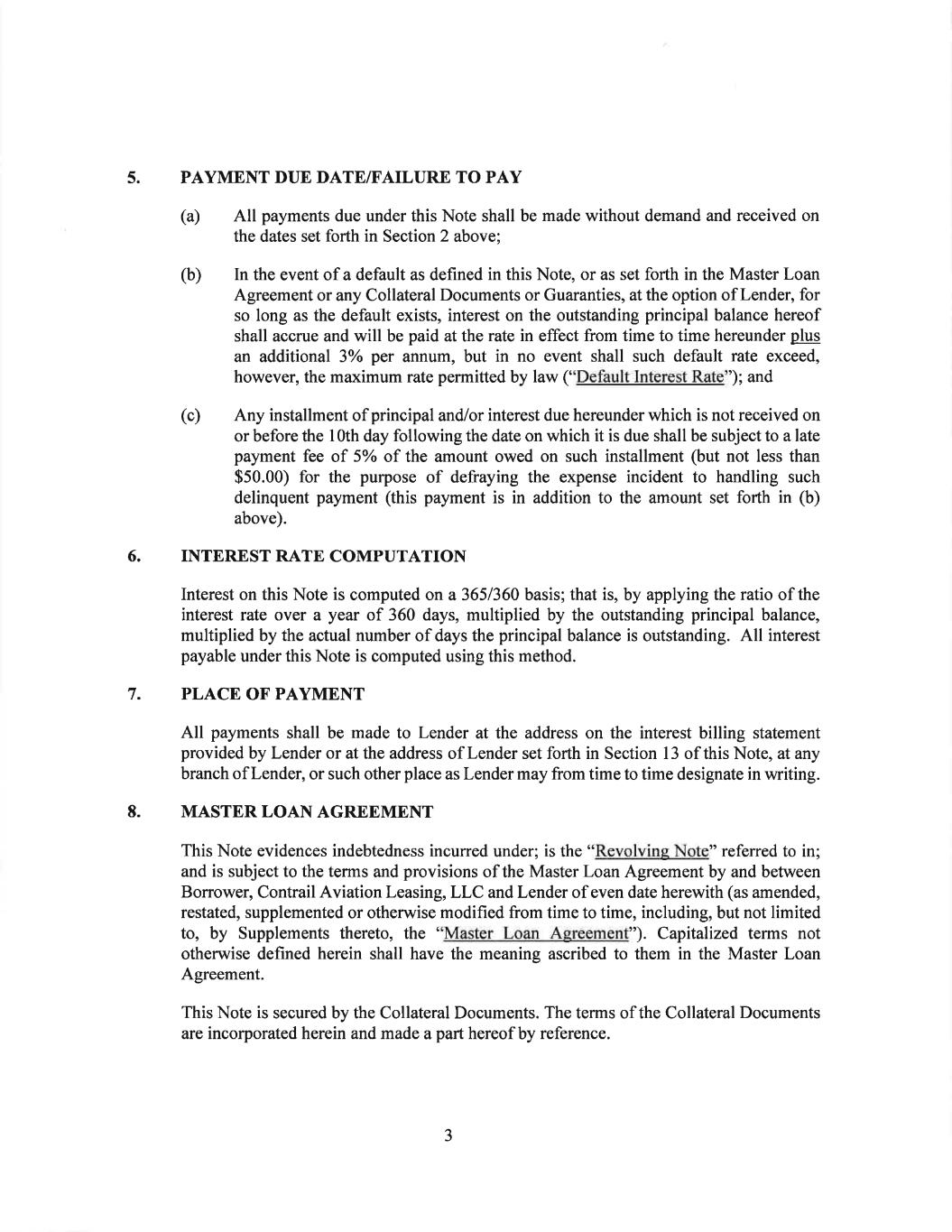 PAYMENT DUE DATE/FAILURE TO PAY (a) All payments due under this Note shall be made without demand and received on the dates set forth in Section 2 above; (b) In the event of a default as defined in this Note, or as set forth in the Master Loan Agreement or any Collateral Documents or Guaranties, at the option of Lender, for so long as the default exists, interest on the outstanding principal balance hereof shall accrue and will be paid at the rate in effect from time to time hereunder plus an additional 3% per annum, but in no event shall such default rate exceed, however, the maximum rate permitted by law (“Default Interest Rate”); and (c) Any installment of principal and/or interest due hereunder which is not received on or before the 10th day following the date on which it is due shall be subject to a late payment fee of 5% of the amount owed on such installment (but not less than $50.00) for the purpose of defraying the expense incident to handling such delinquent payment (this payment is in addition to the amount set forth in (b) above). INTEREST RATE COMPUTATION Interest on this Note is computed on a 365/360 basis; that is, by applying the ratio of the interest rate over a year of 360 days, multiplied by the outstanding principal balance, multiplied by the actual number of days the principal balance is outstanding. All interest payable under this Note is computed using this method. PLACE OF PAYMENT All payments shall be made to Lender at the address on the interest billing statement provided by Lender or at the address of Lender set forth in Section 13 of this Note, at any branch of Lender, or such other place as Lender may from time to time designate in writing. MASTER LOAN AGREEMENT This Note evidences indebtedness incurred under; is the “Revolving Note” referred to in; and is subject to the terms and provisions of the Master Loan Agreement by and between Borrower, Contrail Aviation Leasing, LLC and Lender of even date herewith (as amended, restated, supplemented or otherwise modified from time to time, including, but not limited to, by Supplements thereto, the “Master Loan Agreement”). Capitalized terms not otherwise defined herein shall have the meaning ascribed to them in the Master Loan Agreement. This Note is secured by the Collateral Documents. The terms of the Collateral Documents are incorporated herein and made a part hereof by reference.