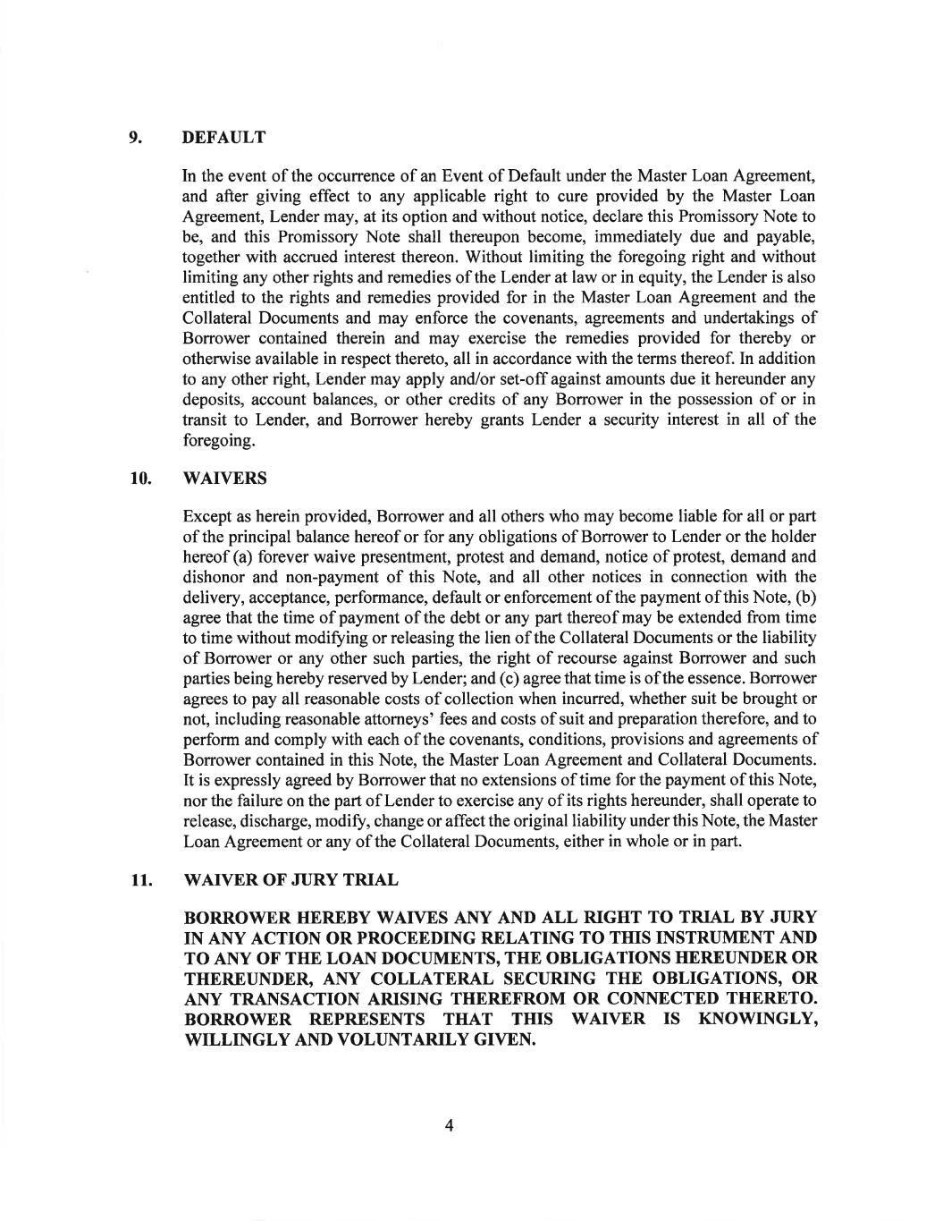 10. 11. DEFAULT In the event of the occurrence of an Event of Default under the Master Loan Agreement, and after giving effect to any applicable right to cure provided by the Master Loan Agreement, Lender may, at its option and without notice, declare this Promissory Note to be, and this Promissory Note shall thereupon become, immediately due and payable, together with accrued interest thereon. Without limiting the foregoing right and without limiting any other rights and remedies of the Lender at law or in equity, the Lender is also entitled to the rights and remedies provided for in the Master Loan Agreement and the Collateral Documents and may enforce the covenants, agreements and undertakings of Borrower contained therein and may exercise the remedies provided for thereby or otherwise available in respect thereto, all in accordance with the terms thereof. In addition to any other right, Lender may apply and/or set-off against amounts due it hereunder any deposits, account balances, or other credits of any Borrower in the possession of or in transit to Lender, and Borrower hereby grants Lender a security interest in all of the foregoing. WAIVERS Except as herein provided, Borrower and all others who may become liable for all or part of the principal balance hereof or for any obligations of Borrower to Lender or the holder hereof (a) forever waive presentment, protest and demand, notice of protest, demand and dishonor and non-payment of this Note, and all other notices in connection with the delivery, acceptance, performance, default or enforcement of the payment of this Note, (b) agree that the time of payment of the debt or any part thereof may be extended from time to time without modifying or releasing the lien of the Collateral Documents or the liability of Borrower or any other such parties, the right of recourse against Borrower and such parties being hereby reserved by Lender; and (c) agree that time is of the essence. Borrower agrees to pay all reasonable costs of collection when incurred, whether suit be brought or not, including reasonable attorneys’ fees and costs of suit and preparation therefore, and to perform and comply with each of the covenants, conditions, provisions and agreements of Borrower contained in this Note, the Master Loan Agreement and Collateral Documents. It is expressly agreed by Borrower that no extensions of time for the payment of this Note, nor the failure on the part of Lender to exercise any of its rights hereunder, shall operate to release, discharge, modify, change or affect the original liability under this Note, the Master Loan Agreement or any of the Collateral Documents, either in whole or in part. WAIVER OF JURY TRIAL BORROWER HEREBY WAIVES ANY AND ALL RIGHT TO TRIAL BY JURY IN ANY ACTION OR PROCEEDING RELATING TO THIS INSTRUMENT AND TO ANY OF THE LOAN DOCUMENTS, THE OBLIGATIONS HEREUNDER OR THEREUNDER, ANY COLLATERAL SECURING THE OBLIGATIONS, OR ANY TRANSACTION ARISING THEREFROM OR CONNECTED THERETO. BORROWER REPRESENTS THAT THIS WAIVER IS KNOWINGLY, WILLINGLY AND VOLUNTARILY GIVEN.