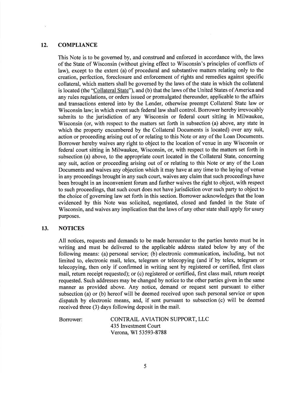 12. 13. COMPLIANCE This Note is to be governed by, and construed and enforced in accordance with, the laws of the State of Wisconsin (without giving effect to Wisconsin’s principles of conflicts of law), except to the extent (a) of procedural and substantive matters relating only to the creation, perfection, foreclosure and enforcement of rights and remedies against specific collateral, which matters shall be governed by the laws of the state in which the collateral is located (the “Collateral State”), and (b) that the laws of the United States of America and any rules regulations, or orders issued or promulgated thereunder, applicable to the affairs and transactions entered into by the Lender, otherwise preempt Collateral State law or Wisconsin law; in which event such federal law shall control. Borrower hereby irrevocably submits to the jurisdiction of any Wisconsin or federal court sitting in Milwaukee, Wisconsin (or, with respect to the matters set forth in subsection (a) above, any state in which the property encumbered by the Collateral Documents is located) over any suit, action or proceeding arising out of or relating to this Note or any of the Loan Documents. Borrower hereby waives any right to object to the location of venue in any Wisconsin or federal court sitting in Milwaukee, Wisconsin, or, with respect to the matters set forth in subsection (a) above, to the appropriate court located in the Collateral State, concerning any suit, action or proceeding arising out of or relating to this Note or any of the Loan Documents and waives any objection which it may have at any time to the laying of venue in any proceedings brought in any such court, waives any claim that such proceedings have been brought in an inconvenient forum and further waives the right to object, with respect to such proceedings, that such court does not have jurisdiction over such party to object to the choice of governing law set forth in this section. Borrower acknowledges that the loan evidenced by this Note was solicited, negotiated, closed and funded in the State of Wisconsin, and waives any implication that the laws of any other state shall apply for usury purposes. NOTICES All notices, requests and demands to be made hereunder to the parties hereto must be in writing and must be delivered to the applicable address stated below by any of the following means: (a) personal service; (b) electronic communication, including, but not limited to, electronic mail, telex, telegram or telecopying (and if by telex, telegram or telecopying, then only if confirmed in writing sent by registered or certified, first class mail, return receipt requested); or (c) registered or certified, first class mail, return receipt requested. Such addresses may be changed by notice to the other parties given in the same manner as provided above. Any notice, demand or request sent pursuant to either subsection (a) or (b) hereof will be deemed received upon such personal service or upon dispatch by electronic means, and, if sent pursuant to subsection (c) will be deemed received three (3) days following deposit in the mail. Borrower: CONTRAIL AVIATION SUPPORT, LLC 435 Investment Court Verona, WI 53593-8788