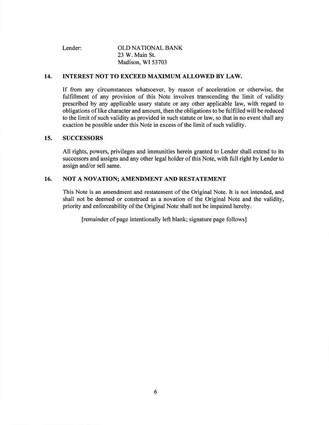 14. 15. 16. Lender: OLD NATIONAL BANK 23 W. Main St. Madison, WI 53703 INTEREST NOT TO EXCEED MAXIMUM ALLOWED BY LAW. If from any circumstances whatsoever, by reason of acceleration or otherwise, the fulfillment of any provision of this Note involves transcending the limit of validity prescribed by any applicable usury statute or any other applicable law, with regard to obligations of like character and amount, then the obligations to be fulfilled will be reduced to the limit of such validity as provided in such statute or law, so that in no event shall any exaction be possible under this Note in excess of the limit of such validity. SUCCESSORS All rights, powers, privileges and immunities herein granted to Lender shall extend to its successors and assigns and any other legal holder of this Note, with full right by Lender to assign and/or sell same. NOT A NOVATION; AMENDMENT AND RESTATEMENT This Note is an amendment and restatement of the Original Note. It is not intended, and shall not be deemed or construed as a novation of the Original Note and the validity, priority and enforceability of the Original Note shall not be impaired hereby. [remainder of page intentionally left blank; signature page follows]