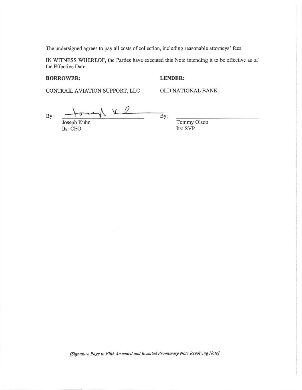 The undersigned agrees to pay all costs of collection, including reasonable attorneys’ fees. IN WITNESS WHEREOF, the Parties have executed this Note intending it to be effective as of the Effective Date. BORROWER: LENDER: CONTRAIL AVIATION SUPPORT, LLC OLD NATIONAL BANK By: By: vorimy O07 Joseph Kuhn Tommy Olson Its: CEO Its: SVP [Signature Page to Fifth Amended and Restated Promissory Note Revolving Note]