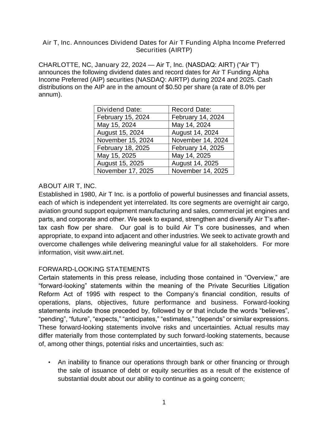 1 Air T, Inc. Announces Dividend Dates for Air T Funding Alpha Income Preferred Securities (AIRTP) CHARLOTTE, NC, January 22, 2024 — Air T, Inc. (NASDAQ: AIRT) (“Air T”) announces the following dividend dates and record dates for Air T Funding Alpha Income Preferred (AIP) securities (NASDAQ: AIRTP) during 2024 and 2025. Cash distributions on the AIP are in the amount of $0.50 per share (a rate of 8.0% per annum). Dividend Date: Record Date: February 15, 2024 February 14, 2024 May 15, 2024 May 14, 2024 August 15, 2024 August 14, 2024 November 15, 2024 November 14, 2024 February 18, 2025 February 14, 2025 May 15, 2025 May 14, 2025 August 15, 2025 August 14, 2025 November 17, 2025 November 14, 2025 ABOUT AIR T, INC. Established in 1980, Air T Inc. is a portfolio of powerful businesses and financial assets, each of which is independent yet interrelated. Its core segments are overnight air cargo, aviation ground support equipment manufacturing and sales, commercial jet engines and parts, and corporate and other. We seek to expand, strengthen and diversify Air T’s after- tax cash flow per share. Our goal is to build Air T’s core businesses, and when appropriate, to expand into adjacent and other industries. We seek to activate growth and overcome challenges while delivering meaningful value for all stakeholders. For more information, visit www.airt.net. FORWARD-LOOKING STATEMENTS Certain statements in this press release, including those contained in “Overview,” are “forward-looking” statements within the meaning of the Private Securities Litigation Reform Act of 1995 with respect to the Company’s financial condition, results of operations, plans, objectives, future performance and business. Forward-looking statements include those preceded by, followed by or that include the words “believes”, “pending”, “future”, “expects,” “anticipates,” “estimates,” “depends” or similar expressions. These forward-looking statements involve risks and uncertainties. Actual results may differ materially from those contemplated by such forward-looking statements, because of, among other things, potential risks and uncertainties, such as: • An inability to finance our operations through bank or other financing or through the sale of issuance of debt or equity securities as a result of the existence of substantial doubt about our ability to continue as a going concern;