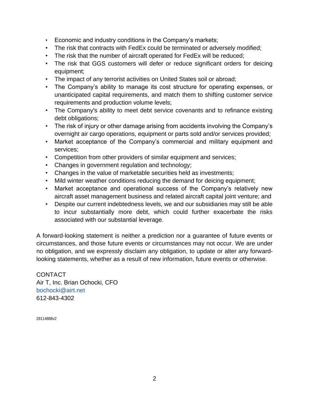 2 • Economic and industry conditions in the Company’s markets; • The risk that contracts with FedEx could be terminated or adversely modified; • The risk that the number of aircraft operated for FedEx will be reduced; • The risk that GGS customers will defer or reduce significant orders for deicing equipment; • The impact of any terrorist activities on United States soil or abroad; • The Company’s ability to manage its cost structure for operating expenses, or unanticipated capital requirements, and match them to shifting customer service requirements and production volume levels; • The Company's ability to meet debt service covenants and to refinance existing debt obligations; • The risk of injury or other damage arising from accidents involving the Company’s overnight air cargo operations, equipment or parts sold and/or services provided; • Market acceptance of the Company’s commercial and military equipment and services; • Competition from other providers of similar equipment and services; • Changes in government regulation and technology; • Changes in the value of marketable securities held as investments; • Mild winter weather conditions reducing the demand for deicing equipment; • Market acceptance and operational success of the Company’s relatively new aircraft asset management business and related aircraft capital joint venture; and • Despite our current indebtedness levels, we and our subsidiaries may still be able to incur substantially more debt, which could further exacerbate the risks associated with our substantial leverage. A forward-looking statement is neither a prediction nor a guarantee of future events or circumstances, and those future events or circumstances may not occur. We are under no obligation, and we expressly disclaim any obligation, to update or alter any forward- looking statements, whether as a result of new information, future events or otherwise. CONTACT Air T, Inc. Brian Ochocki, CFO bochocki@airt.net 612-843-4302 28114888v2
