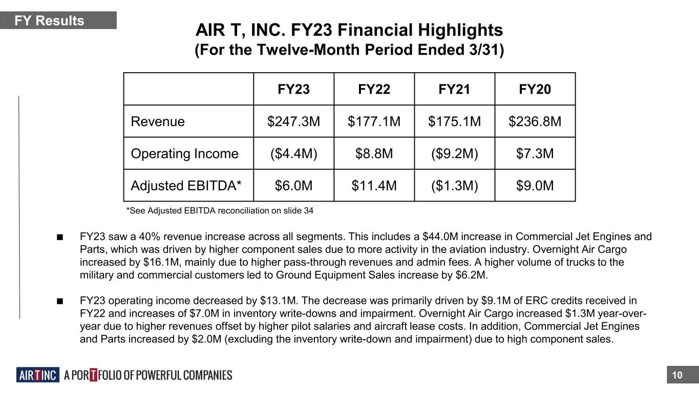 $247M 9 FY23 Revenue $6.0M FY23 Adj. EBITDA* 3 CORE SEGMENTS 14 COMPANIES 584 EMPLOYEES OVERNIGHT AIR CARGO COMMERCIAL JET ENGINES AND PARTS GROUND EQUIPMENT SALES *See Adjusted EBITDA reconciliation on slide 34