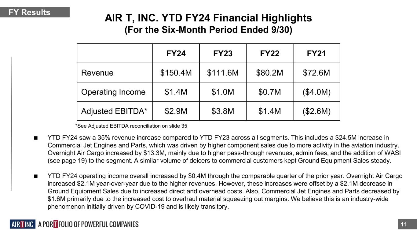 AIR T, INC. FY23 Financial Highlights (For the Twelve-Month Period Ended 3/31) 10 FY Results ■ FY23 saw a 40% revenue increase across all segments. This includes a $44.0M increase in Commercial Jet Engines and Parts, which was driven by higher component sales due to more activity in the aviation industry. Overnight Air Cargo increased by $16.1M, mainly due to higher pass-through revenues and admin fees. A higher volume of trucks to the military and commercial customers led to Ground Equipment Sales increase by $6.2M. ■ FY23 operating income decreased by $13.1M. The decrease was primarily driven by $9.1M of ERC credits received in FY22 and increases of $7.0M in inventory write-downs and impairment. Overnight Air Cargo increased $1.3M year-over- year due to higher revenues offset by higher pilot salaries and aircraft lease costs. In addition, Commercial Jet Engines and Parts increased by $2.0M (excluding the inventory write-down and impairment) due to high component sales. FY23 FY22 FY21 FY20 Revenue $247.3M $177.1M $175.1M $236.8M Operating Income ($4.4M) $8.8M ($9.2M) $7.3M Adjusted EBITDA* $6.0M $11.4M ($1.3M) $9.0M *See Adjusted EBITDA reconciliation on slide 34