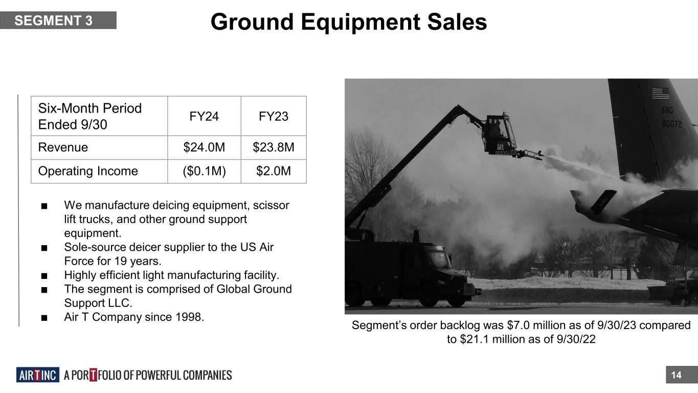 Overnight Air Cargo 13 SEGMENT 2 ■ We operate two of the seven FedEx feeder airlines. ■ Business units Mountain Air Cargo and CSA Air have a 41-year history with FedEx. ■ Air T Companies since 1982, 1983 ■ Air T added Worldwide Aircraft Services (WASI) to this segment in Q4 FY23. ■ Revenues and operating income increased due to an increased fleet and addition of WASI (see page 19) partially offset by higher pilot salaries and aircraft lease costs. An asset-light, predictable business. Six-Month Period Ended 9/30 FY24 FY23 Revenue $56.0M $42.6M Operating Income $4.0M $1.9M