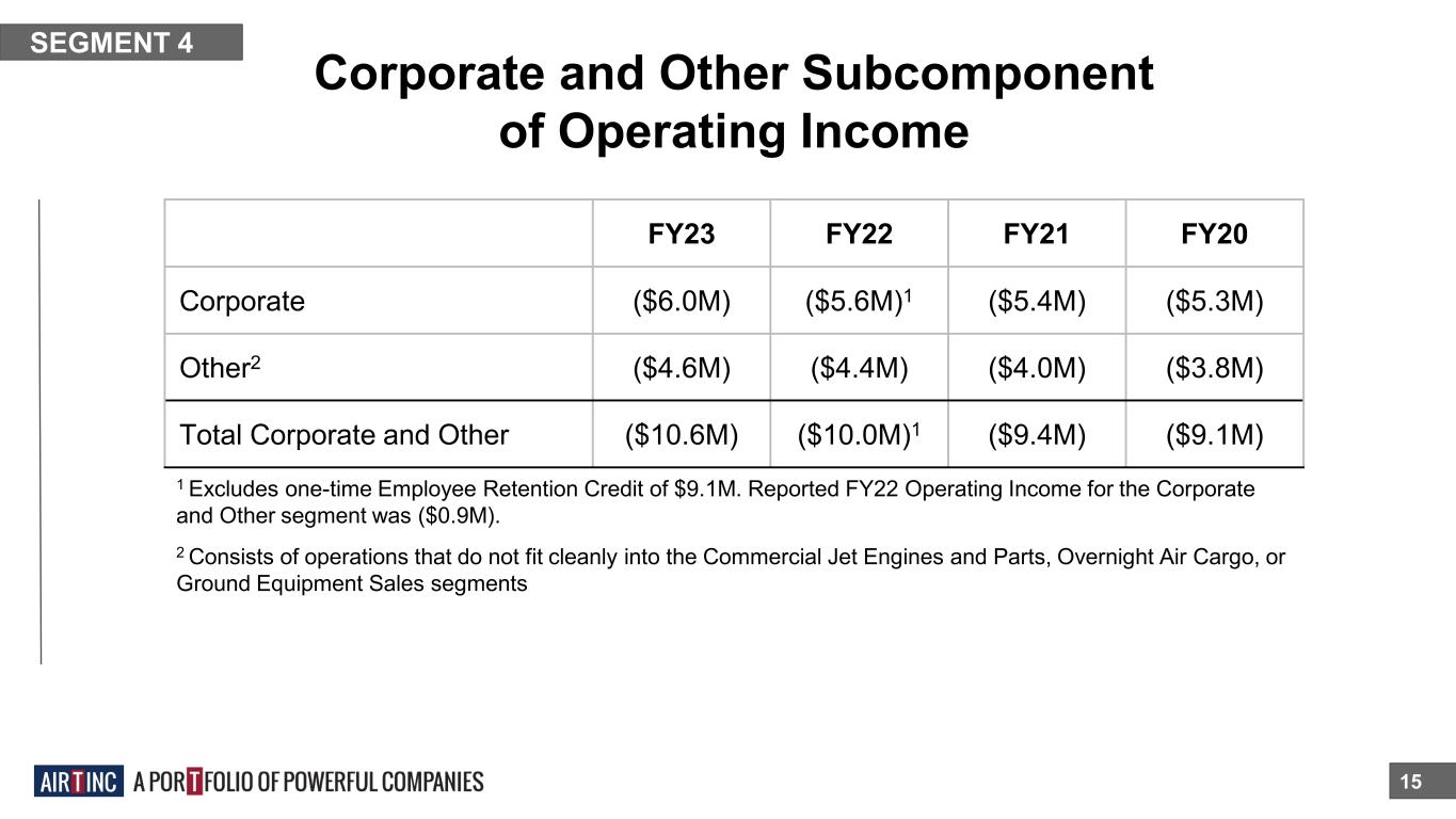 15 SEGMENT 4 FY23 FY22 FY21 FY20 Corporate ($6.0M) ($5.6M)1 ($5.4M) ($5.3M) Other2 ($4.6M) ($4.4M) ($4.0M) ($3.8M) Total Corporate and Other ($10.6M) ($10.0M)1 ($9.4M) ($9.1M) Corporate and Other Subcomponent of Operating Income 1 Excludes one-time Employee Retention Credit of $9.1M. Reported FY22 Operating Income for the Corporate and Other segment was ($0.9M). 2 Consists of operations that do not fit cleanly into the Commercial Jet Engines and Parts, Overnight Air Cargo, or Ground Equipment Sales segments