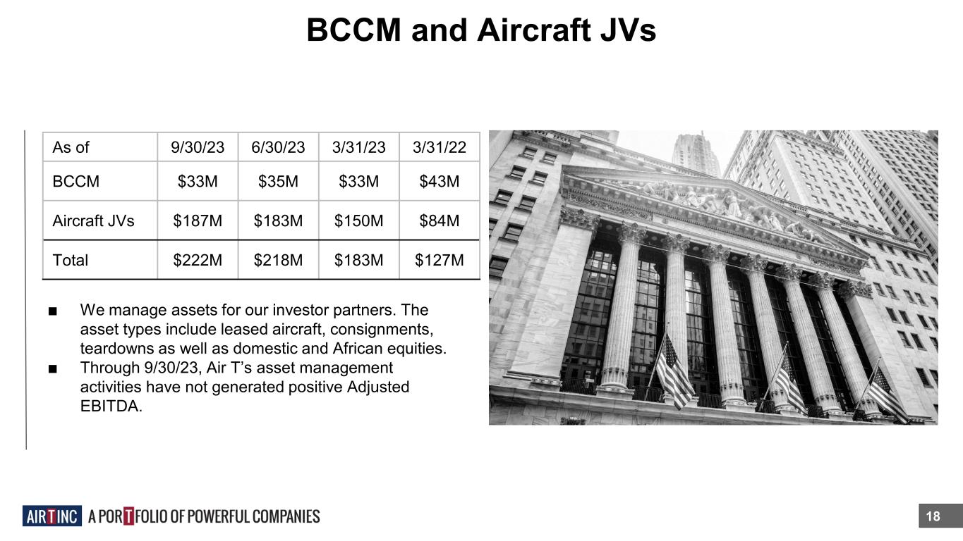 Air T Digital 17 ■ We invest in companies that provide digital aviation and other business services that generate recurring subscription revenues. As of 9/30/23 6/30/23 3/31/23 3/31/22 ARR1 $5.4M $5.0M $4.7M $3.9M 1ARR, or Annual Recurring Revenue, is defined as the monthly recurring revenue as of September 30, 2023, June 30, 2023, March 31, 2023, and March 31, 2022, multiplied by 12