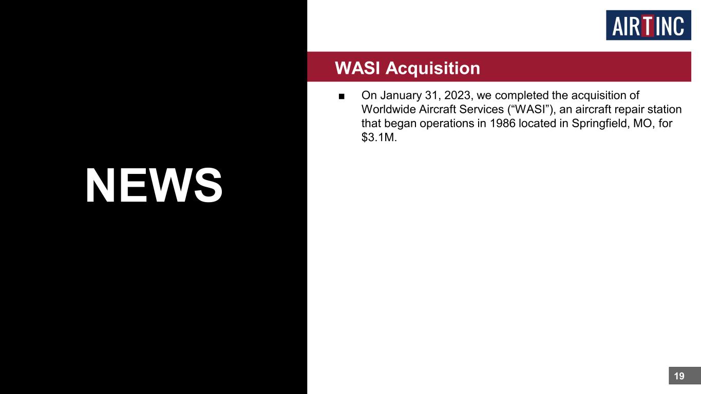■ On January 31, 2023, we completed the acquisition of Worldwide Aircraft Services (“WASI”), an aircraft repair station that began operations in 1986 located in Springfield, MO, for $3.1M. 19 WASI Acquisition NEWS