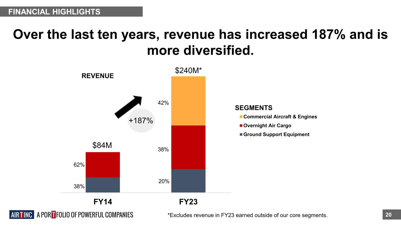 FY14 FY23 Commercial Aircraft & Engines Overnight Air Cargo Ground Support Equipment FINANCIAL HIGHLIGHTS Over the last ten years, revenue has increased 187% and is more diversified. 20 +187% $240M* $84M SEGMENTS REVENUE 62% 38% 38% 20% 42% *Excludes revenue in FY23 earned outside of our core segments.