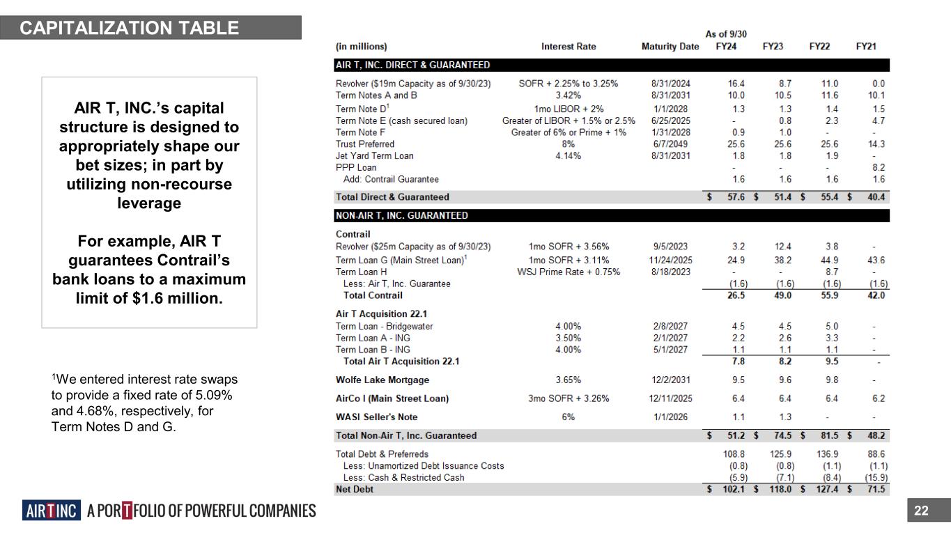Non-Operating Assets 21 AIR T, Inc. owns the following public and private securities: OTHER AIR T, INC. Non-Operating Assets (In Millions) 9/30/23 3/31/23 3/31/22 3/31/21 3/31/20 Lendway, Inc. (LDWY) Stock – 0.5M Shares1,2 $2.5 $3.8 $4.6 $4.3 $2.6 CCI Investment (20.1% as of 9/30/23)3 $4.0 $3.1 $2.6 $3.8 $3.4 Oxbridge RE (OXBR) Stock – 0.5M Shares1 $0.4 Investments in BCCM Funds $0.5 $0.5 $0.7 $0.9 $0.3 Aircraft Asset Management Investments $7.8 $8.2 $7.0 TFS Partners LLC Investment2 $0.3 $0.3 $0.3 $0.6 $0.5 Other Investments $1.3 $2.2 $2.6 $2.9 $2.8 Total $16.4 $18.1 $17.8 $12.5 $10.0 1 Based on the closing price at the time of investor presentation publish. 9/30/23 is as of 11/8/23 at $5.06. 2 Formerly Insignia Systems, Inc. (ISIG) 3 9/30 Carrying value reflects the equity method of accounting.