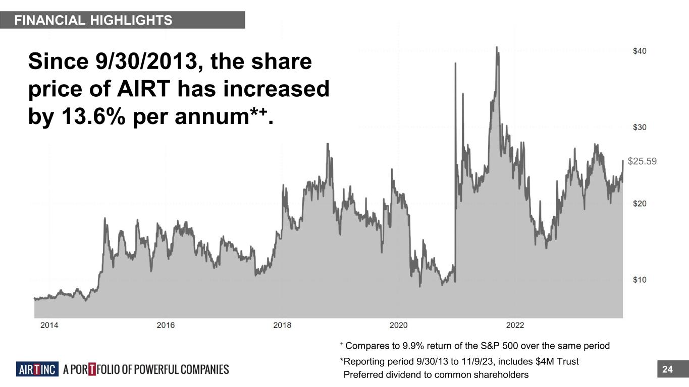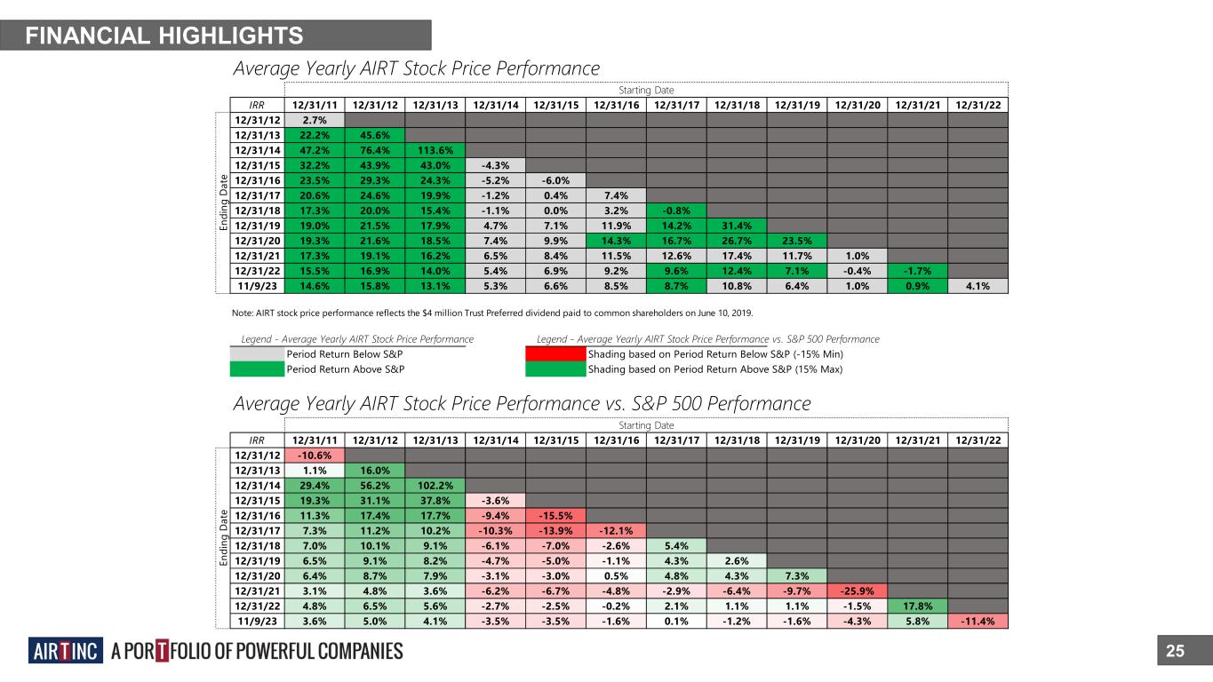FINANCIAL HIGHLIGHTS 24 Since 9/30/2013, the share price of AIRT has increased by 13.6% per annum*+. *Reporting period 9/30/13 to 11/9/23, includes $4M Trust *Preferred dividend to common shareholders + Compares to 9.9% return of the S&P 500 over the same period $25.59