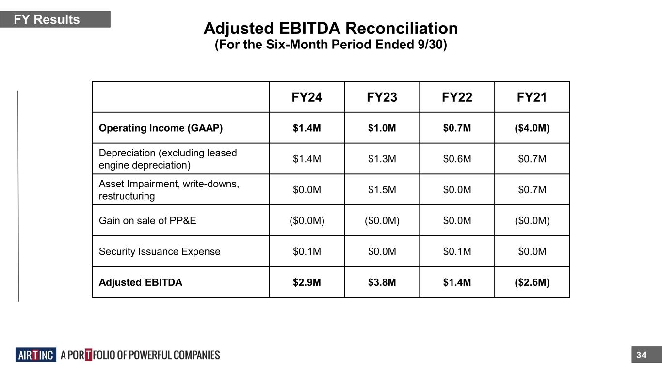 Adjusted EBITDA Reconciliation 33 FY Results FY23 FY22 FY21 FY20 Operating Income (GAAP) ($4.4M) $8.8M* ($9.2M) 7.3M Depreciation (excluding leased engine depreciation) $2.5M $1.6M $1.2M $1.3M Asset Impairment, write-downs, restructuring $7.8M $0.8M $6.6M $0.0M Gain on sale of PP&E $0.0M $0.0M ($0.0M) ($0.0M) Security Issuance Expense $0.1M $0.3M $0.0M $0.4M Adjusted EBITDA $6.0M $11.4M* ($1.3M) $9.0M *Includes one-time ERC credit of $9.1M (For the Twelve-Month Period Ended 3/31)