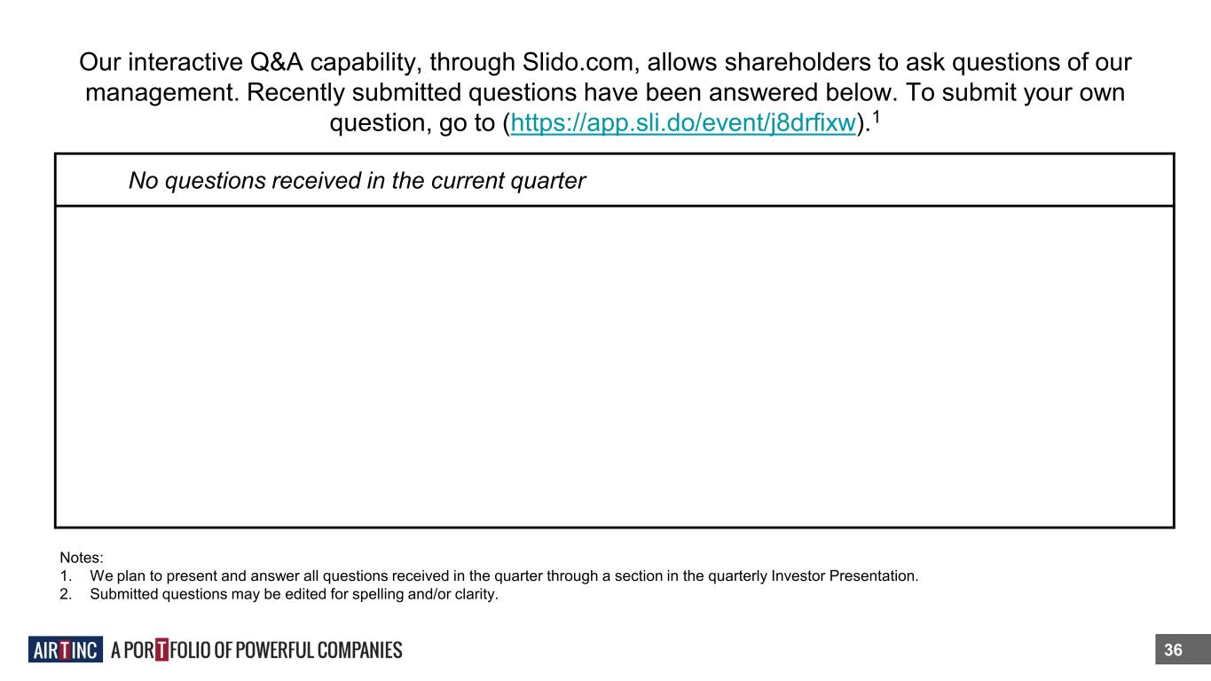 Our interactive Q&A capability, through Slido.com, allows shareholders to ask questions of our management. Recently submitted questions have been answered below. To submit your own question, go to (https://app.sli.do/event/j8drfixw).1 36 No questions received in the current quarter Notes: 1. We plan to present and answer all questions received in the quarter through a section in the quarterly Investor Presentation. 2. Submitted questions may be edited for spelling and/or clarity.