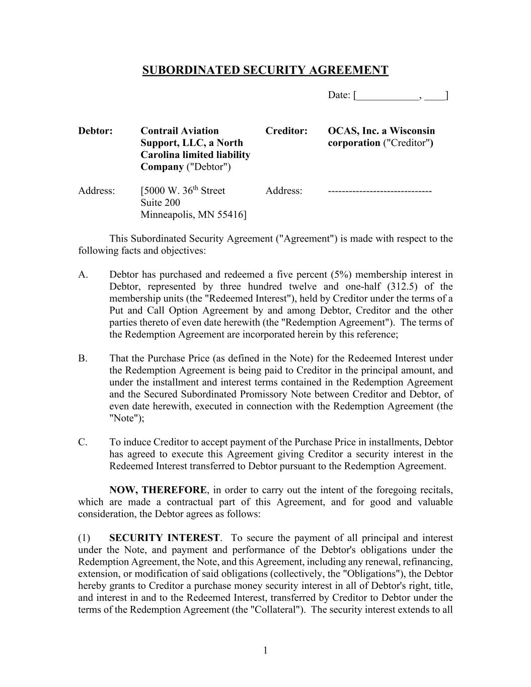 1 SUBORDINATED SECURITY AGREEMENT Date: [____________, ____] Debtor: Contrail Aviation Creditor: OCAS, Inc. a Wisconsin Support, LLC, a North corporation ("Creditor") Carolina limited liability Company ("Debtor") Address: [5000 W. 36th Street Address: ------------------------------ Suite 200 Minneapolis, MN 55416] This Subordinated Security Agreement ("Agreement") is made with respect to the following facts and objectives: A. Debtor has purchased and redeemed a five percent (5%) membership interest in Debtor, represented by three hundred twelve and one-half (312.5) of the membership units (the "Redeemed Interest"), held by Creditor under the terms of a Put and Call Option Agreement by and among Debtor, Creditor and the other parties thereto of even date herewith (the "Redemption Agreement"). The terms of the Redemption Agreement are incorporated herein by this reference; B. That the Purchase Price (as defined in the Note) for the Redeemed Interest under the Redemption Agreement is being paid to Creditor in the principal amount, and under the installment and interest terms contained in the Redemption Agreement and the Secured Subordinated Promissory Note between Creditor and Debtor, of even date herewith, executed in connection with the Redemption Agreement (the "Note"); C. To induce Creditor to accept payment of the Purchase Price in installments, Debtor has agreed to execute this Agreement giving Creditor a security interest in the Redeemed Interest transferred to Debtor pursuant to the Redemption Agreement. NOW, THEREFORE, in order to carry out the intent of the foregoing recitals, which are made a contractual part of this Agreement, and for good and valuable consideration, the Debtor agrees as follows: (1) SECURITY INTEREST. To secure the payment of all principal and interest under the Note, and payment and performance of the Debtor's obligations under the Redemption Agreement, the Note, and this Agreement, including any renewal, refinancing, extension, or modification of said obligations (collectively, the "Obligations"), the Debtor hereby grants to Creditor a purchase money security interest in all of Debtor's right, title, and interest in and to the Redeemed Interest, transferred by Creditor to Debtor under the terms of the Redemption Agreement (the "Collateral"). The security interest extends to all