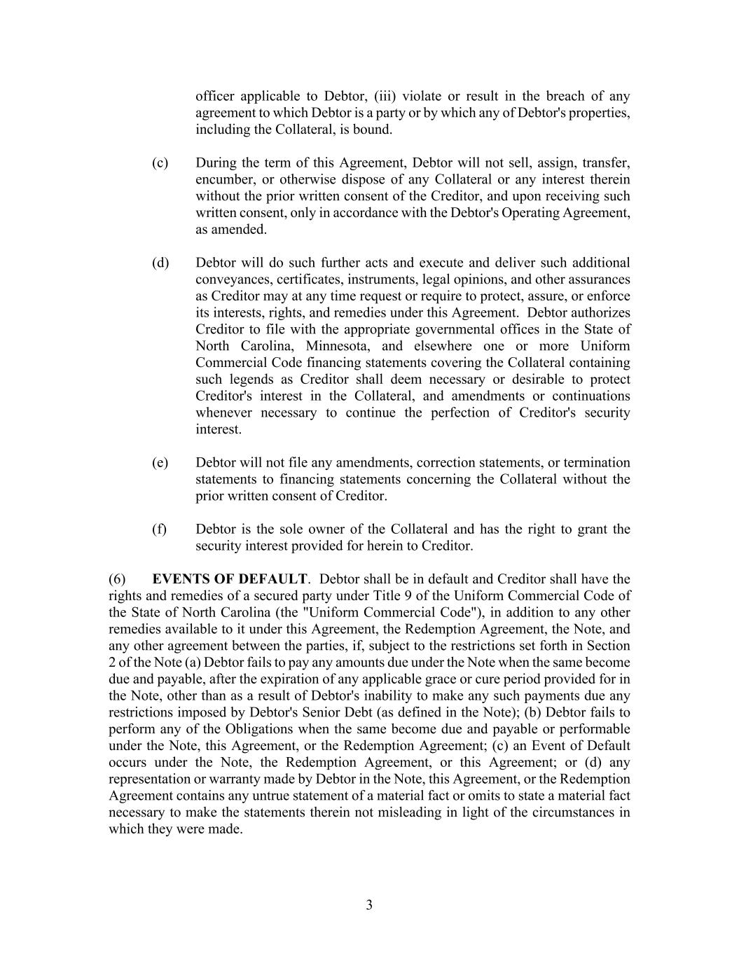 3 officer applicable to Debtor, (iii) violate or result in the breach of any agreement to which Debtor is a party or by which any of Debtor's properties, including the Collateral, is bound. (c) During the term of this Agreement, Debtor will not sell, assign, transfer, encumber, or otherwise dispose of any Collateral or any interest therein without the prior written consent of the Creditor, and upon receiving such written consent, only in accordance with the Debtor's Operating Agreement, as amended. (d) Debtor will do such further acts and execute and deliver such additional conveyances, certificates, instruments, legal opinions, and other assurances as Creditor may at any time request or require to protect, assure, or enforce its interests, rights, and remedies under this Agreement. Debtor authorizes Creditor to file with the appropriate governmental offices in the State of North Carolina, Minnesota, and elsewhere one or more Uniform Commercial Code financing statements covering the Collateral containing such legends as Creditor shall deem necessary or desirable to protect Creditor's interest in the Collateral, and amendments or continuations whenever necessary to continue the perfection of Creditor's security interest. (e) Debtor will not file any amendments, correction statements, or termination statements to financing statements concerning the Collateral without the prior written consent of Creditor. (f) Debtor is the sole owner of the Collateral and has the right to grant the security interest provided for herein to Creditor. (6) EVENTS OF DEFAULT. Debtor shall be in default and Creditor shall have the rights and remedies of a secured party under Title 9 of the Uniform Commercial Code of the State of North Carolina (the "Uniform Commercial Code"), in addition to any other remedies available to it under this Agreement, the Redemption Agreement, the Note, and any other agreement between the parties, if, subject to the restrictions set forth in Section 2 of the Note (a) Debtor fails to pay any amounts due under the Note when the same become due and payable, after the expiration of any applicable grace or cure period provided for in the Note, other than as a result of Debtor's inability to make any such payments due any restrictions imposed by Debtor's Senior Debt (as defined in the Note); (b) Debtor fails to perform any of the Obligations when the same become due and payable or performable under the Note, this Agreement, or the Redemption Agreement; (c) an Event of Default occurs under the Note, the Redemption Agreement, or this Agreement; or (d) any representation or warranty made by Debtor in the Note, this Agreement, or the Redemption Agreement contains any untrue statement of a material fact or omits to state a material fact necessary to make the statements therein not misleading in light of the circumstances in which they were made.