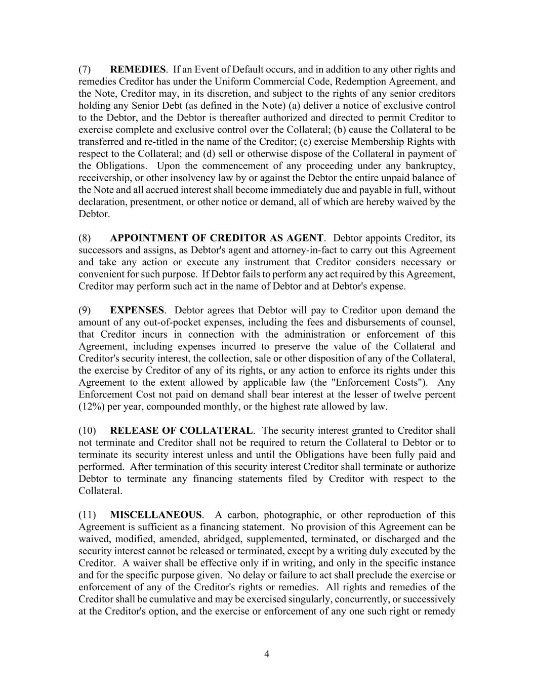 4 (7) REMEDIES. If an Event of Default occurs, and in addition to any other rights and remedies Creditor has under the Uniform Commercial Code, Redemption Agreement, and the Note, Creditor may, in its discretion, and subject to the rights of any senior creditors holding any Senior Debt (as defined in the Note) (a) deliver a notice of exclusive control to the Debtor, and the Debtor is thereafter authorized and directed to permit Creditor to exercise complete and exclusive control over the Collateral; (b) cause the Collateral to be transferred and re-titled in the name of the Creditor; (c) exercise Membership Rights with respect to the Collateral; and (d) sell or otherwise dispose of the Collateral in payment of the Obligations. Upon the commencement of any proceeding under any bankruptcy, receivership, or other insolvency law by or against the Debtor the entire unpaid balance of the Note and all accrued interest shall become immediately due and payable in full, without declaration, presentment, or other notice or demand, all of which are hereby waived by the Debtor. (8) APPOINTMENT OF CREDITOR AS AGENT. Debtor appoints Creditor, its successors and assigns, as Debtor's agent and attorney-in-fact to carry out this Agreement and take any action or execute any instrument that Creditor considers necessary or convenient for such purpose. If Debtor fails to perform any act required by this Agreement, Creditor may perform such act in the name of Debtor and at Debtor's expense. (9) EXPENSES. Debtor agrees that Debtor will pay to Creditor upon demand the amount of any out-of-pocket expenses, including the fees and disbursements of counsel, that Creditor incurs in connection with the administration or enforcement of this Agreement, including expenses incurred to preserve the value of the Collateral and Creditor's security interest, the collection, sale or other disposition of any of the Collateral, the exercise by Creditor of any of its rights, or any action to enforce its rights under this Agreement to the extent allowed by applicable law (the "Enforcement Costs"). Any Enforcement Cost not paid on demand shall bear interest at the lesser of twelve percent (12%) per year, compounded monthly, or the highest rate allowed by law. (10) RELEASE OF COLLATERAL. The security interest granted to Creditor shall not terminate and Creditor shall not be required to return the Collateral to Debtor or to terminate its security interest unless and until the Obligations have been fully paid and performed. After termination of this security interest Creditor shall terminate or authorize Debtor to terminate any financing statements filed by Creditor with respect to the Collateral. (11) MISCELLANEOUS. A carbon, photographic, or other reproduction of this Agreement is sufficient as a financing statement. No provision of this Agreement can be waived, modified, amended, abridged, supplemented, terminated, or discharged and the security interest cannot be released or terminated, except by a writing duly executed by the Creditor. A waiver shall be effective only if in writing, and only in the specific instance and for the specific purpose given. No delay or failure to act shall preclude the exercise or enforcement of any of the Creditor's rights or remedies. All rights and remedies of the Creditor shall be cumulative and may be exercised singularly, concurrently, or successively at the Creditor's option, and the exercise or enforcement of any one such right or remedy