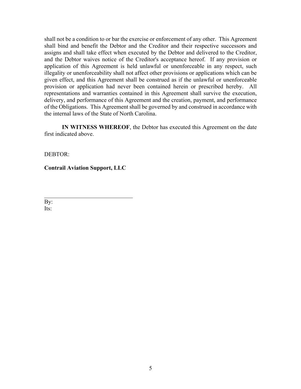 5 shall not be a condition to or bar the exercise or enforcement of any other. This Agreement shall bind and benefit the Debtor and the Creditor and their respective successors and assigns and shall take effect when executed by the Debtor and delivered to the Creditor, and the Debtor waives notice of the Creditor's acceptance hereof. If any provision or application of this Agreement is held unlawful or unenforceable in any respect, such illegality or unenforceability shall not affect other provisions or applications which can be given effect, and this Agreement shall be construed as if the unlawful or unenforceable provision or application had never been contained herein or prescribed hereby. All representations and warranties contained in this Agreement shall survive the execution, delivery, and performance of this Agreement and the creation, payment, and performance of the Obligations. This Agreement shall be governed by and construed in accordance with the internal laws of the State of North Carolina. IN WITNESS WHEREOF, the Debtor has executed this Agreement on the date first indicated above. DEBTOR: Contrail Aviation Support, LLC ______________________________ By: Its: