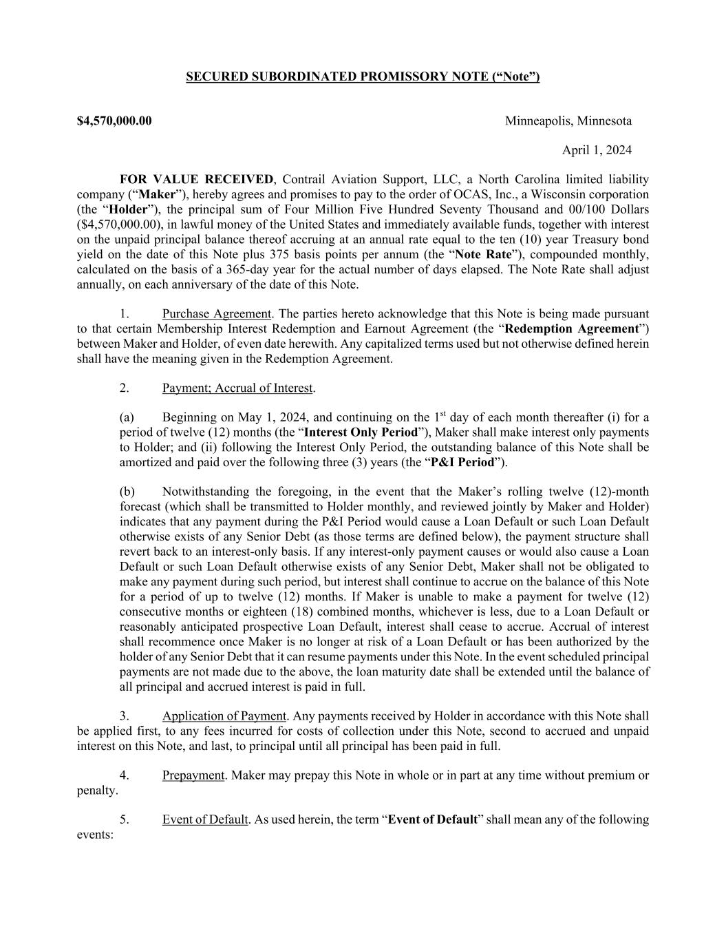SECURED SUBORDINATED PROMISSORY NOTE (“Note”) $4,570,000.00 Minneapolis, Minnesota April 1, 2024 FOR VALUE RECEIVED, Contrail Aviation Support, LLC, a North Carolina limited liability company (“Maker”), hereby agrees and promises to pay to the order of OCAS, Inc., a Wisconsin corporation (the “Holder”), the principal sum of Four Million Five Hundred Seventy Thousand and 00/100 Dollars ($4,570,000.00), in lawful money of the United States and immediately available funds, together with interest on the unpaid principal balance thereof accruing at an annual rate equal to the ten (10) year Treasury bond yield on the date of this Note plus 375 basis points per annum (the “Note Rate”), compounded monthly, calculated on the basis of a 365-day year for the actual number of days elapsed. The Note Rate shall adjust annually, on each anniversary of the date of this Note. 1. Purchase Agreement. The parties hereto acknowledge that this Note is being made pursuant to that certain Membership Interest Redemption and Earnout Agreement (the “Redemption Agreement”) between Maker and Holder, of even date herewith. Any capitalized terms used but not otherwise defined herein shall have the meaning given in the Redemption Agreement. 2. Payment; Accrual of Interest. (a) Beginning on May 1, 2024, and continuing on the 1st day of each month thereafter (i) for a period of twelve (12) months (the “Interest Only Period”), Maker shall make interest only payments to Holder; and (ii) following the Interest Only Period, the outstanding balance of this Note shall be amortized and paid over the following three (3) years (the “P&I Period”). (b) Notwithstanding the foregoing, in the event that the Maker’s rolling twelve (12)-month forecast (which shall be transmitted to Holder monthly, and reviewed jointly by Maker and Holder) indicates that any payment during the P&I Period would cause a Loan Default or such Loan Default otherwise exists of any Senior Debt (as those terms are defined below), the payment structure shall revert back to an interest-only basis. If any interest-only payment causes or would also cause a Loan Default or such Loan Default otherwise exists of any Senior Debt, Maker shall not be obligated to make any payment during such period, but interest shall continue to accrue on the balance of this Note for a period of up to twelve (12) months. If Maker is unable to make a payment for twelve (12) consecutive months or eighteen (18) combined months, whichever is less, due to a Loan Default or reasonably anticipated prospective Loan Default, interest shall cease to accrue. Accrual of interest shall recommence once Maker is no longer at risk of a Loan Default or has been authorized by the holder of any Senior Debt that it can resume payments under this Note. In the event scheduled principal payments are not made due to the above, the loan maturity date shall be extended until the balance of all principal and accrued interest is paid in full. 3. Application of Payment. Any payments received by Holder in accordance with this Note shall be applied first, to any fees incurred for costs of collection under this Note, second to accrued and unpaid interest on this Note, and last, to principal until all principal has been paid in full. 4. Prepayment. Maker may prepay this Note in whole or in part at any time without premium or penalty. 5. Event of Default. As used herein, the term “Event of Default” shall mean any of the following events: