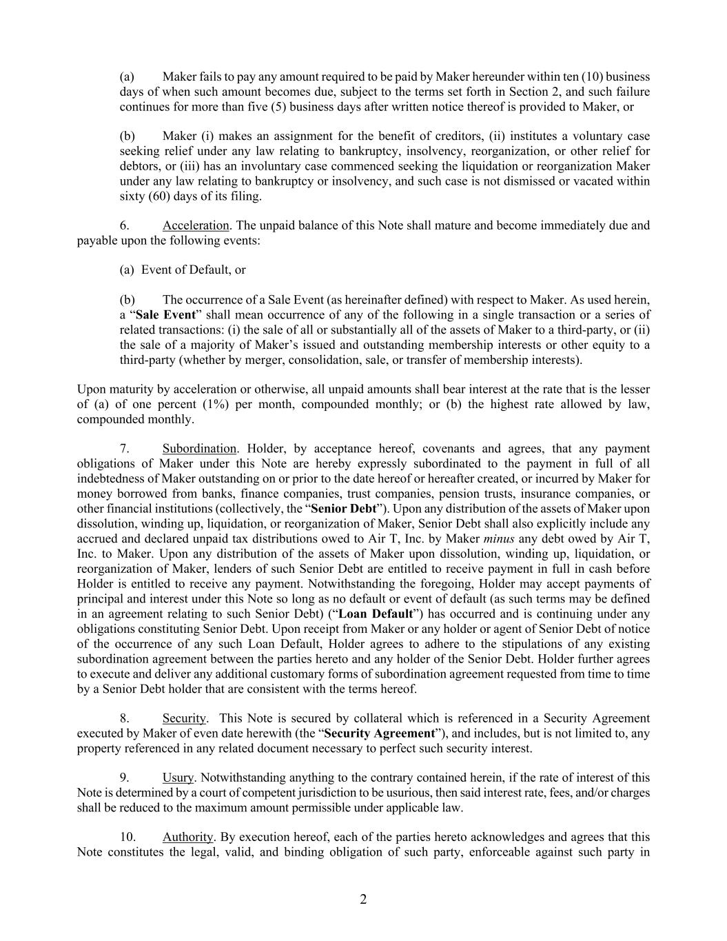 2 (a) Maker fails to pay any amount required to be paid by Maker hereunder within ten (10) business days of when such amount becomes due, subject to the terms set forth in Section 2, and such failure continues for more than five (5) business days after written notice thereof is provided to Maker, or (b) Maker (i) makes an assignment for the benefit of creditors, (ii) institutes a voluntary case seeking relief under any law relating to bankruptcy, insolvency, reorganization, or other relief for debtors, or (iii) has an involuntary case commenced seeking the liquidation or reorganization Maker under any law relating to bankruptcy or insolvency, and such case is not dismissed or vacated within sixty (60) days of its filing. 6. Acceleration. The unpaid balance of this Note shall mature and become immediately due and payable upon the following events: (a) Event of Default, or (b) The occurrence of a Sale Event (as hereinafter defined) with respect to Maker. As used herein, a “Sale Event” shall mean occurrence of any of the following in a single transaction or a series of related transactions: (i) the sale of all or substantially all of the assets of Maker to a third-party, or (ii) the sale of a majority of Maker’s issued and outstanding membership interests or other equity to a third-party (whether by merger, consolidation, sale, or transfer of membership interests). Upon maturity by acceleration or otherwise, all unpaid amounts shall bear interest at the rate that is the lesser of (a) of one percent (1%) per month, compounded monthly; or (b) the highest rate allowed by law, compounded monthly. 7. Subordination. Holder, by acceptance hereof, covenants and agrees, that any payment obligations of Maker under this Note are hereby expressly subordinated to the payment in full of all indebtedness of Maker outstanding on or prior to the date hereof or hereafter created, or incurred by Maker for money borrowed from banks, finance companies, trust companies, pension trusts, insurance companies, or other financial institutions (collectively, the “Senior Debt”). Upon any distribution of the assets of Maker upon dissolution, winding up, liquidation, or reorganization of Maker, Senior Debt shall also explicitly include any accrued and declared unpaid tax distributions owed to Air T, Inc. by Maker minus any debt owed by Air T, Inc. to Maker. Upon any distribution of the assets of Maker upon dissolution, winding up, liquidation, or reorganization of Maker, lenders of such Senior Debt are entitled to receive payment in full in cash before Holder is entitled to receive any payment. Notwithstanding the foregoing, Holder may accept payments of principal and interest under this Note so long as no default or event of default (as such terms may be defined in an agreement relating to such Senior Debt) (“Loan Default”) has occurred and is continuing under any obligations constituting Senior Debt. Upon receipt from Maker or any holder or agent of Senior Debt of notice of the occurrence of any such Loan Default, Holder agrees to adhere to the stipulations of any existing subordination agreement between the parties hereto and any holder of the Senior Debt. Holder further agrees to execute and deliver any additional customary forms of subordination agreement requested from time to time by a Senior Debt holder that are consistent with the terms hereof. 8. Security. This Note is secured by collateral which is referenced in a Security Agreement executed by Maker of even date herewith (the “Security Agreement”), and includes, but is not limited to, any property referenced in any related document necessary to perfect such security interest. 9. Usury. Notwithstanding anything to the contrary contained herein, if the rate of interest of this Note is determined by a court of competent jurisdiction to be usurious, then said interest rate, fees, and/or charges shall be reduced to the maximum amount permissible under applicable law. 10. Authority. By execution hereof, each of the parties hereto acknowledges and agrees that this Note constitutes the legal, valid, and binding obligation of such party, enforceable against such party in