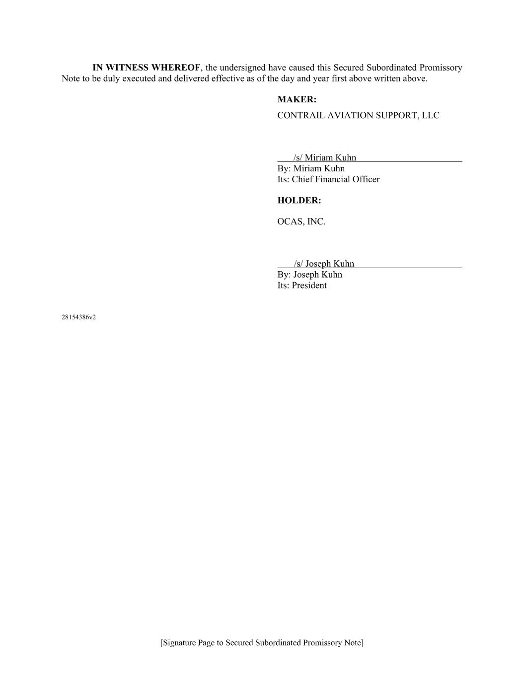 [Signature Page to Secured Subordinated Promissory Note] IN WITNESS WHEREOF, the undersigned have caused this Secured Subordinated Promissory Note to be duly executed and delivered effective as of the day and year first above written above. MAKER: CONTRAIL AVIATION SUPPORT, LLC /s/ Miriam Kuhn By: Miriam Kuhn Its: Chief Financial Officer HOLDER: OCAS, INC. /s/ Joseph Kuhn By: Joseph Kuhn Its: President 28154386v2