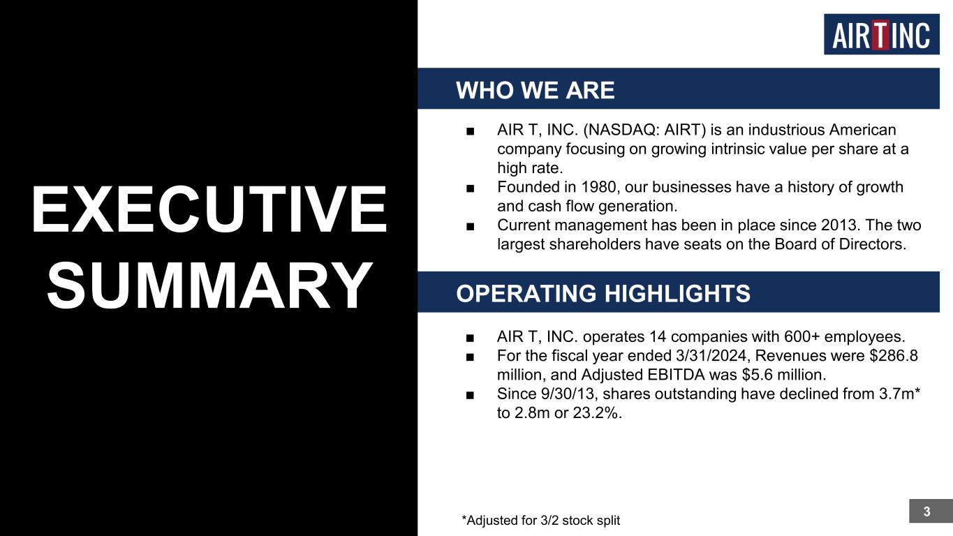3 ■ AIR T, INC. (NASDAQ: AIRT) is an industrious American company focusing on growing intrinsic value per share at a high rate. ■ Founded in 1980, our businesses have a history of growth and cash flow generation. ■ Current management has been in place since 2013. The two largest shareholders have seats on the Board of Directors. WHO WE ARE OPERATING HIGHLIGHTS EXECUTIVE SUMMARY ■ AIR T, INC. operates 14 companies with 600+ employees. ■ For the fiscal year ended 3/31/2024, Revenues were $286.8 million, and Adjusted EBITDA was $5.6 million. ■ Since 9/30/13, shares outstanding have declined from 3.7m* to 2.8m or 23.2%. *Adjusted for 3/2 stock split