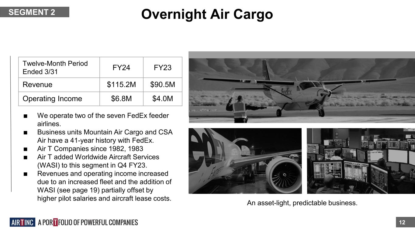 Commercial Jet Engines and Parts 11 SEGMENT 1 ■ We buy aircraft and engines, then either lease, trade, or send them to part out. ■ We supply parts to maintenance, repair, and overhaul facilities (MRO). ■ Companies in this segment include Contrail, AirCo, AirCo Services, Worthington, Jet Yard, Air’Zona, and LGSS. ■ Sales continue to rebound with additional activity in the aviation industry. A niche between aircraft owners and MRO shops, this segment will seek to grow by coordinating activities and raising investment capital. Twelve-Month Period Ended 3/31 FY24 FY23 Revenue $125.5M $101.7M Operating Income $4.2M ($1.0M)