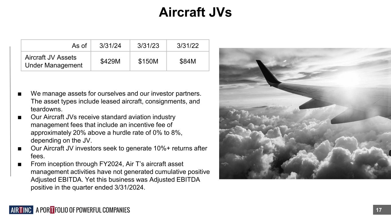 Air T Digital 16 ■ We invest in companies that provide digital aviation and other business services that generate recurring subscription revenues. As of 3/31/24 3/31/23 3/31/22 ARR1 $5.9M $4.7M $3.9M 1ARR, or Annual Recurring Revenue, is defined as the monthly recurring revenue as of March 31, 2024, March 31, 2023, and March 31, 2022, multiplied by 12