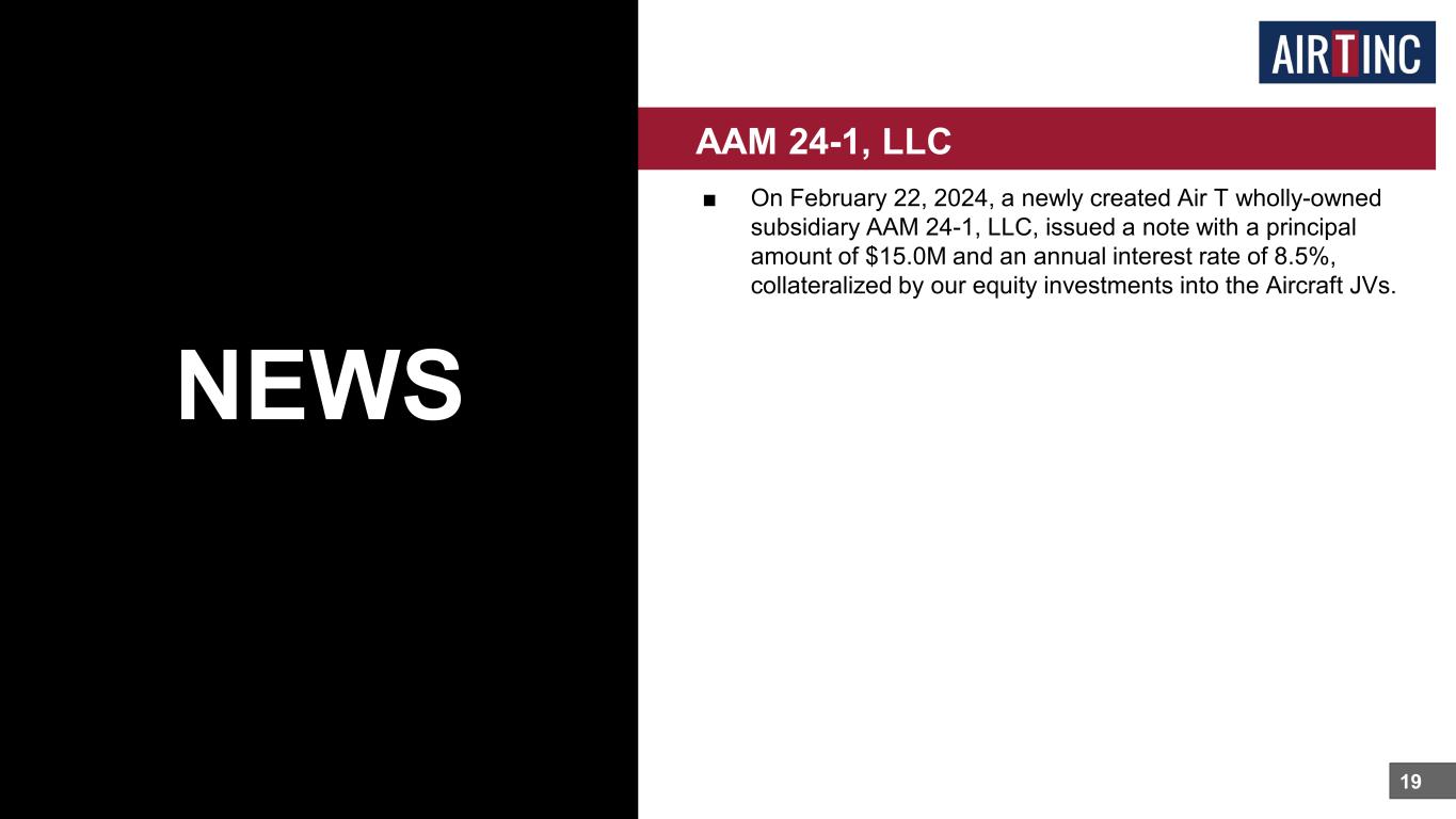 ■ On February 22, 2024, a newly created Air T wholly-owned subsidiary AAM 24-1, LLC, issued a note with a principal amount of $15.0M and an annual interest rate of 8.5%, collateralized by our equity investments into the Aircraft JVs. 19 AAM 24-1, LLC NEWS
