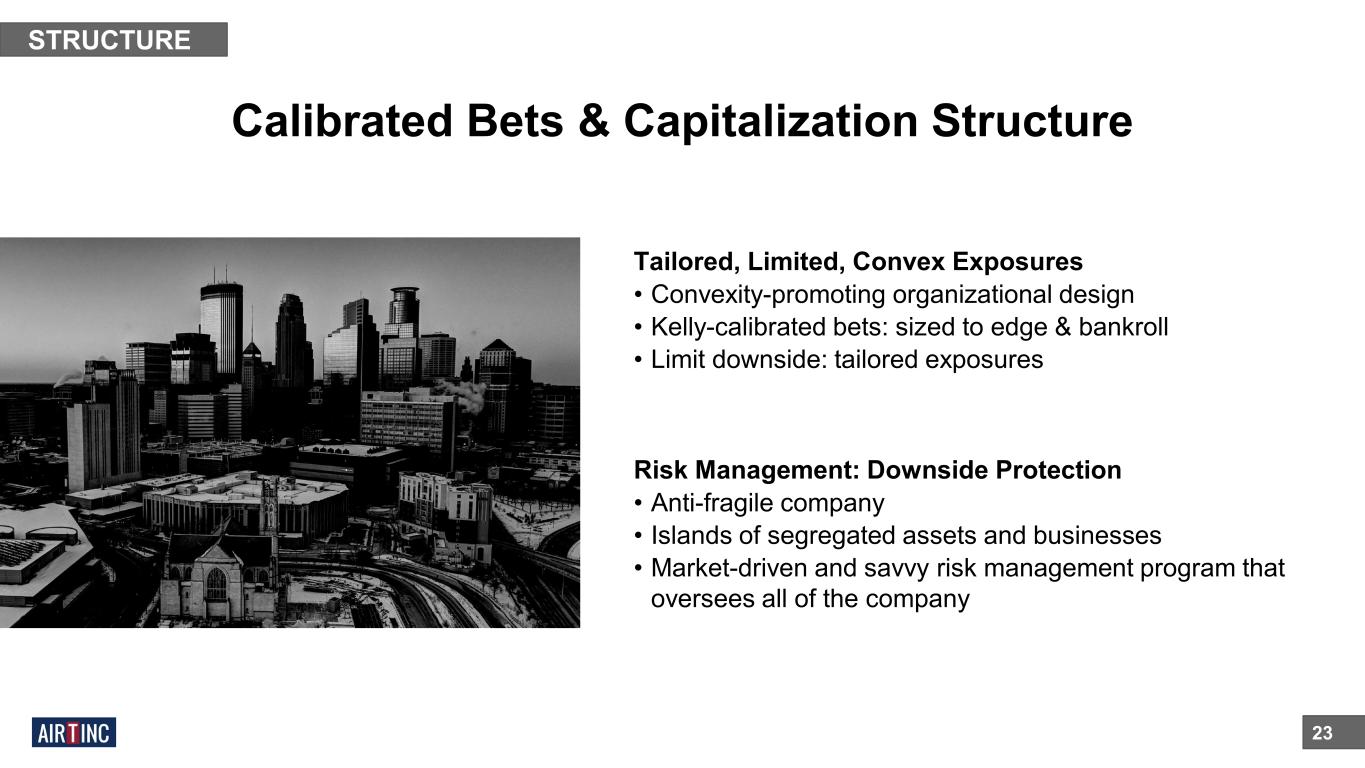 Calibrated Bets & Capitalization Structure 23 Risk Management: Downside Protection • Anti-fragile company • Islands of segregated assets and businesses • Market-driven and savvy risk management program that oversees all of the company STRUCTURE Tailored, Limited, Convex Exposures • Convexity-promoting organizational design • Kelly-calibrated bets: sized to edge & bankroll • Limit downside: tailored exposures