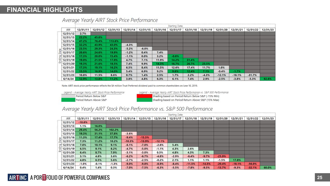 FINANCIAL HIGHLIGHTS 24 Since 12/31/2013, the share price of AIRT has increased by 11.7% per annum*+. *Reporting period 9/30/13 to 6/14/24, includes $4M Trust *Preferred dividend to common shareholders + Compares to 11.6% return of the S&P 500 over the same period $22.85