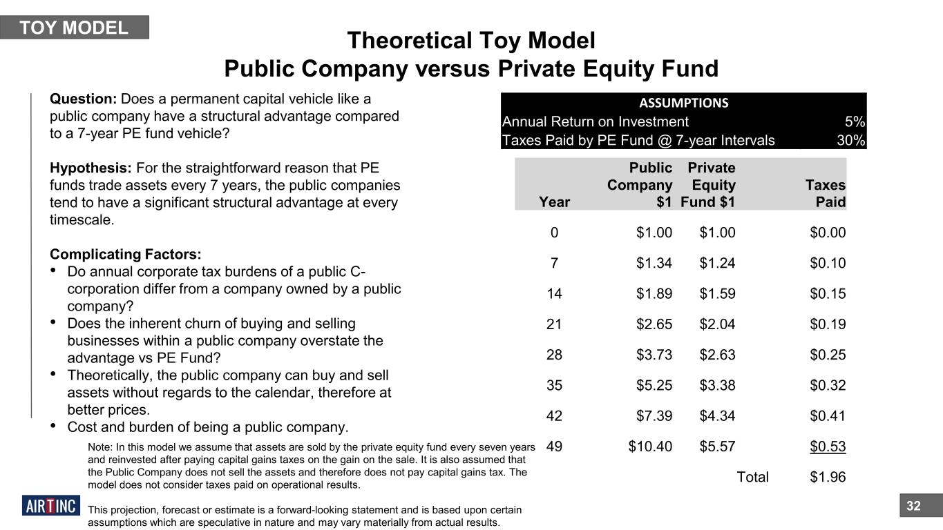 Theoretical Toy Model Public Company versus Private Equity Fund 32 TOY MODEL ASSUMPTIONS Annual Return on Investment 5% Taxes Paid by PE Fund @ 7-year Intervals 30% Year Public Company $1 Private Equity Fund $1 Taxes Paid 0 $1.00 $1.00 $0.00 7 $1.34 $1.24 $0.10 14 $1.89 $1.59 $0.15 21 $2.65 $2.04 $0.19 28 $3.73 $2.63 $0.25 35 $5.25 $3.38 $0.32 42 $7.39 $4.34 $0.41 49 $10.40 $5.57 $0.53 Total $1.96 Question: Does a permanent capital vehicle like a public company have a structural advantage compared to a 7-year PE fund vehicle? Hypothesis: For the straightforward reason that PE funds trade assets every 7 years, the public companies tend to have a significant structural advantage at every timescale. Complicating Factors: • Do annual corporate tax burdens of a public C- corporation differ from a company owned by a public company? • Does the inherent churn of buying and selling businesses within a public company overstate the advantage vs PE Fund? • Theoretically, the public company can buy and sell assets without regards to the calendar, therefore at better prices. • Cost and burden of being a public company. Note: In this model we assume that assets are sold by the private equity fund every seven years and reinvested after paying capital gains taxes on the gain on the sale. It is also assumed that the Public Company does not sell the assets and therefore does not pay capital gains tax. The model does not consider taxes paid on operational results. This projection, forecast or estimate is a forward-looking statement and is based upon certain assumptions which are speculative in nature and may vary materially from actual results.