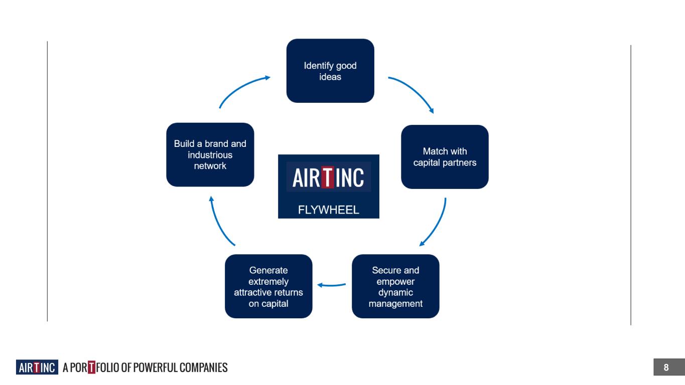 “Investor-Operator Partnership” is designed to drive short and long-term value creation. 7 “We want our businesses to be managed by dynamic individuals within high-performance teams. We are set up to make space for dynamos and support their enterprises. The holding company team seeks to focus resources, activate growth and deliver long-term value for everyone associated with AIR T, INC.” - Nick Swenson