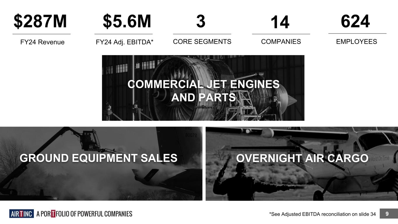 $287M 9 FY24 Revenue $5.6M FY24 Adj. EBITDA* 3 CORE SEGMENTS 14 COMPANIES 624 EMPLOYEES OVERNIGHT AIR CARGO COMMERCIAL JET ENGINES AND PARTS GROUND EQUIPMENT SALES *See Adjusted EBITDA reconciliation on slide 34
