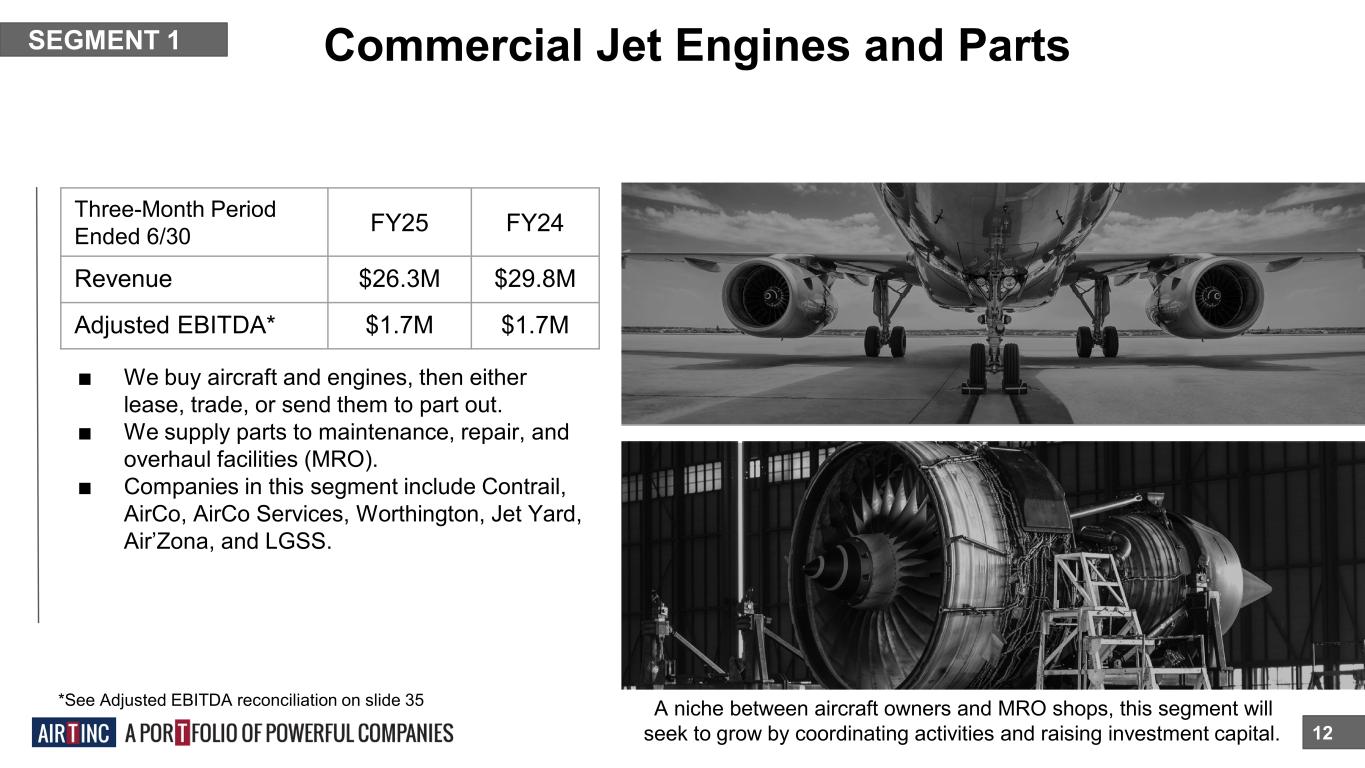 AIR T, INC. FY25 Q1 Financial Highlights (For the Three-Month Period Ended 6/30) 11 FY Results ■ FY25 Q1 Revenue down slightly versus FY24, but remained significantly higher than previous years. $2.7M increase by Overnight Air Cargo (due to increased fleet size) offset by lower sales volumes by Ground Equipment Sales and Commercial Jet Engine and Parts. ■ FY25 Q1 Adjusted EBITDA decreased by $0.7M to the comparable quarter of prior year. Overnight Air Cargo decreased slightly by $0.1M year-over-year due to higher revenues offset by higher pilot salaries and aircraft lease costs. Commercial Jet Engines and Parts remained flat due to higher margins offsetting lower sales. Ground Equipment Sales decreased by $0.6M due to lower sales volume. FY25 FY24 FY23 FY22 FY21 Revenue $66.4M $71.4M $50.8M $37.0M $37.0M Operating Income ($0.6M) $0.7M $0.8M ($0.0M) ($0.3M) Adjusted EBITDA* $0.7M $1.4M $1.5M $0.3M $0.1M *See Adjusted EBITDA reconciliation on slide 35