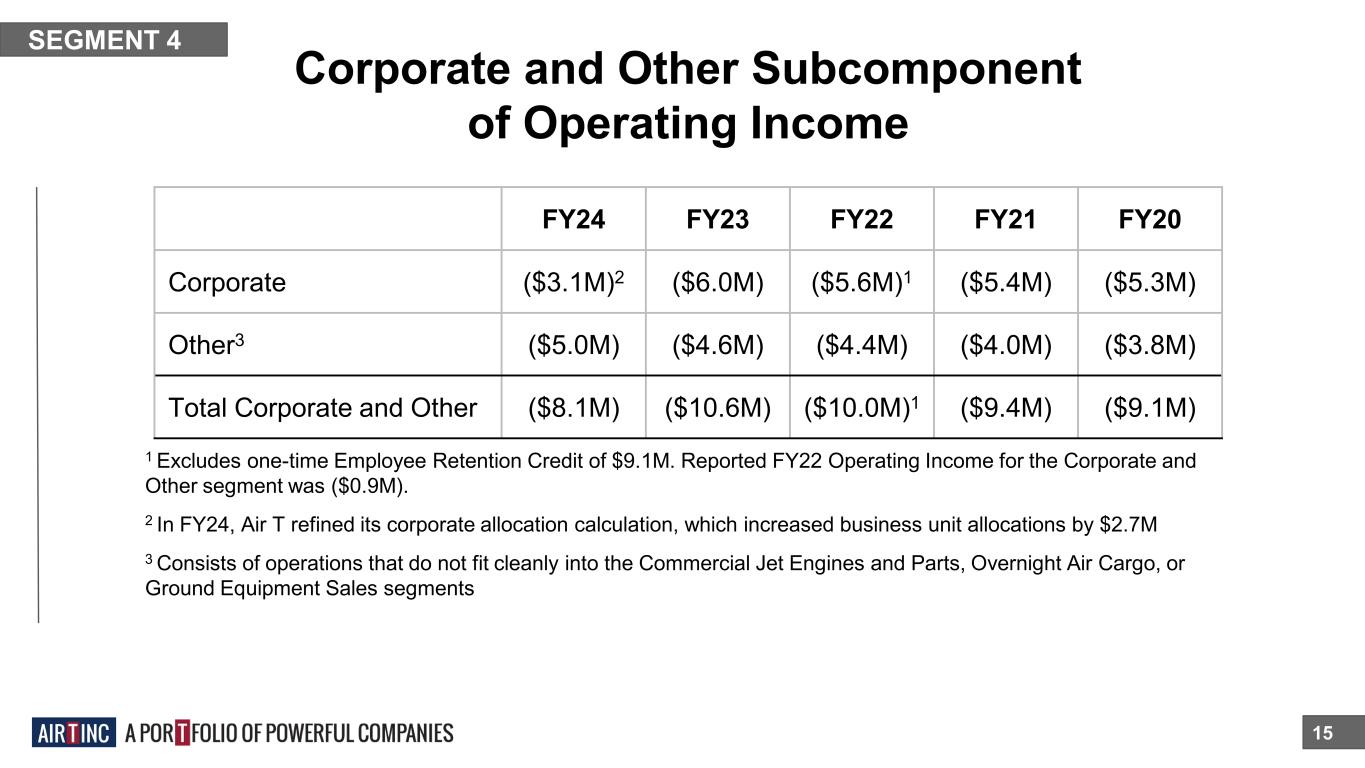Ground Equipment Sales 14 SEGMENT 3 ■ We manufacture deicing equipment, scissor lift trucks, and other ground support equipment. ■ Sole-source deicer supplier to the US Air Force for 20 years. ■ Highly efficient light manufacturing facility. ■ The segment is comprised of Global Ground Support LLC. ■ Air T Company since 1998. Segment’s order backlog was $9.9 million as of 6/30/24 compared to $13.7 million as of 6/30/23 Three-Month Period Ended 6/30 FY25 FY24 Revenue $7.4M $11.8M Adjusted EBITDA* ($0.7M) ($0.0M) *See Adjusted EBITDA reconciliation on slide 35