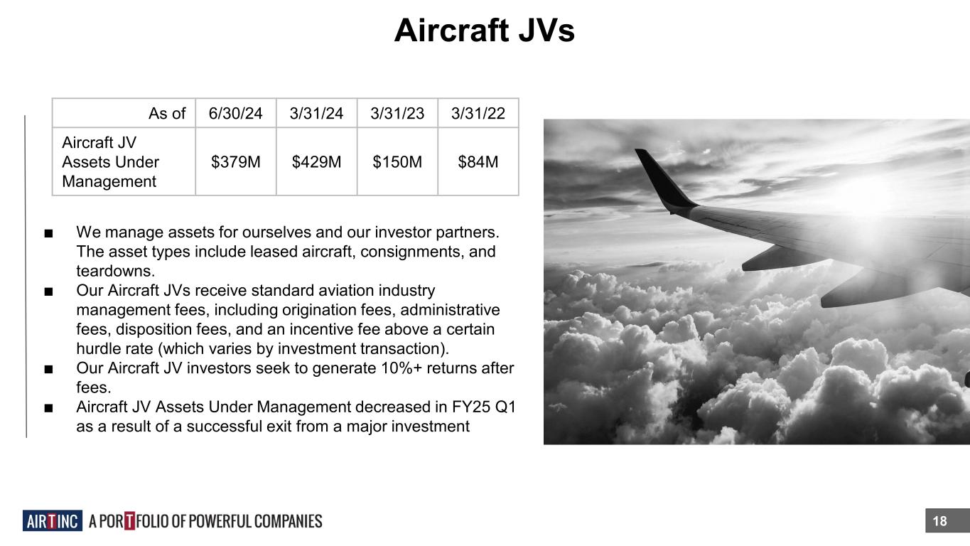Aircraft JVs 18 ■ We manage assets for ourselves and our investor partners. The asset types include leased aircraft, consignments, and teardowns. ■ Our Aircraft JVs receive standard aviation industry management fees, including origination fees, administrative fees, disposition fees, and an incentive fee above a certain hurdle rate (which varies by investment transaction). ■ Our Aircraft JV investors seek to generate 10%+ returns after fees. ■ Aircraft JV Assets Under Management decreased in FY25 Q1 as a result of a successful exit from a major investment As of 6/30/24 3/31/24 3/31/23 3/31/22 Aircraft JV Assets Under Management $379M $429M $150M $84M