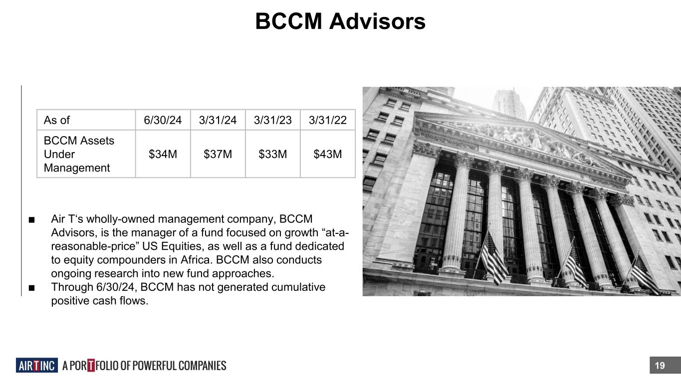 BCCM Advisors 19 ■ Air T‘s wholly-owned management company, BCCM Advisors, is the manager of a fund focused on growth “at-a- reasonable-price” US Equities, as well as a fund dedicated to equity compounders in Africa. BCCM also conducts ongoing research into new fund approaches. ■ Through 6/30/24, BCCM has not generated cumulative positive cash flows. As of 6/30/24 3/31/24 3/31/23 3/31/22 BCCM Assets Under Management $34M $37M $33M $43M
