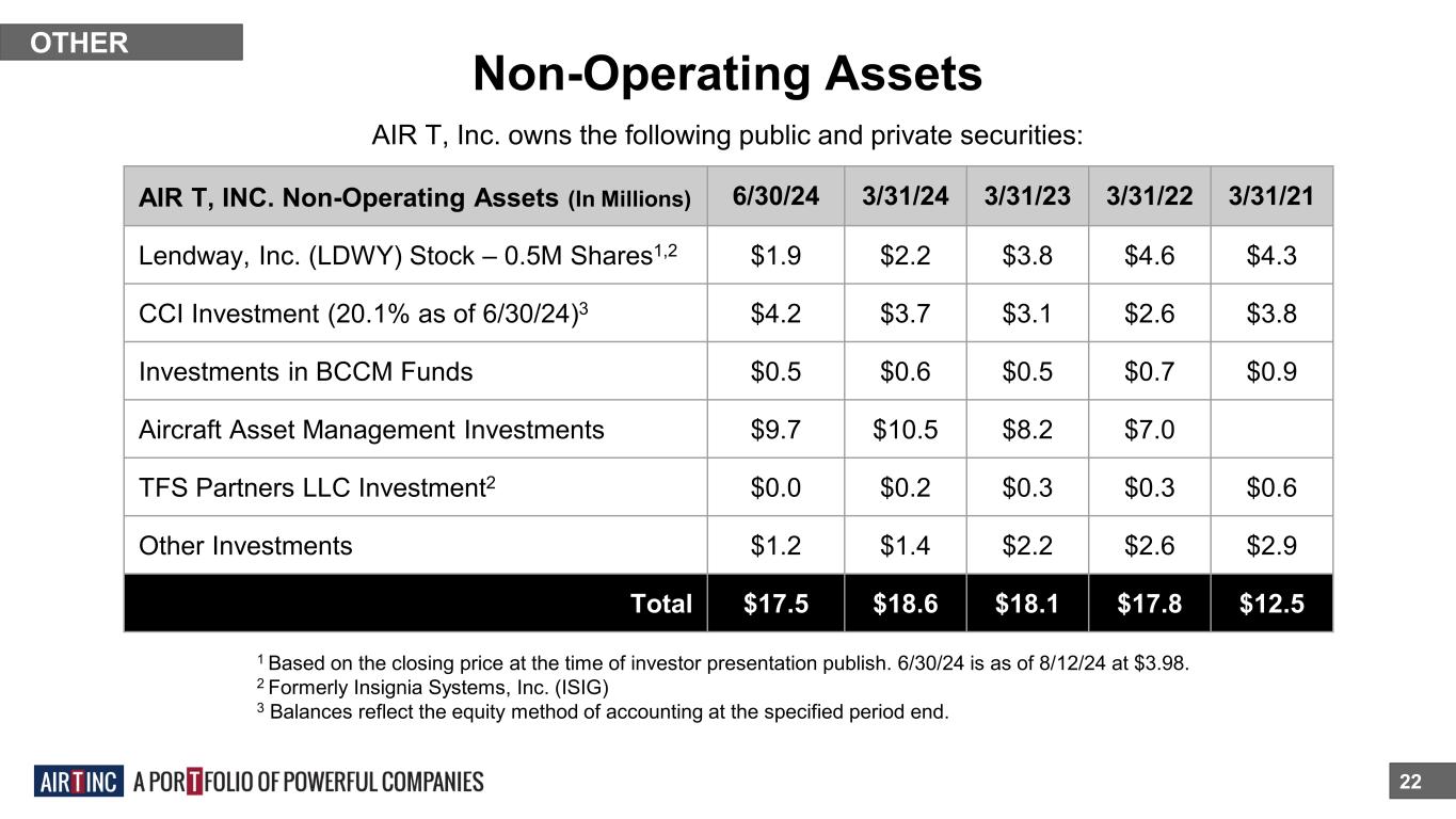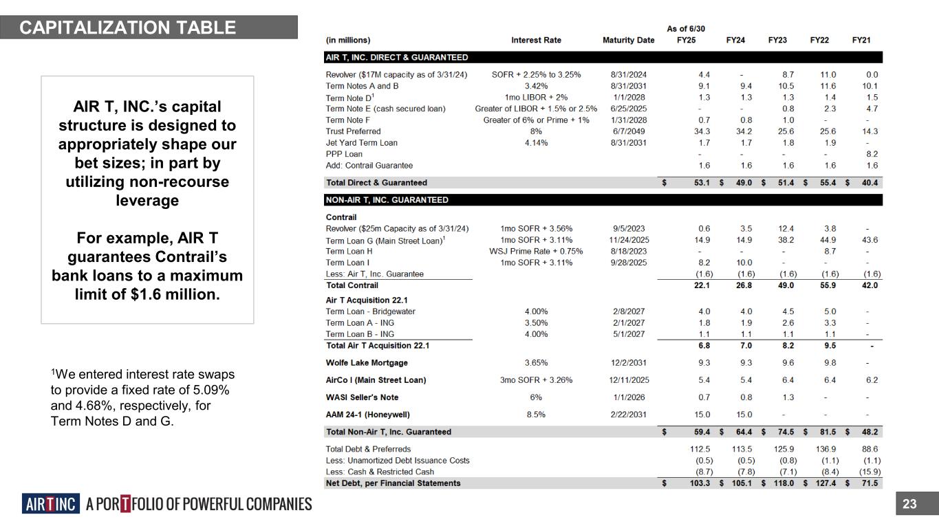 Non-Operating Assets 22 AIR T, Inc. owns the following public and private securities: OTHER AIR T, INC. Non-Operating Assets (In Millions) 6/30/24 3/31/24 3/31/23 3/31/22 3/31/21 Lendway, Inc. (LDWY) Stock – 0.5M Shares1,2 $1.9 $2.2 $3.8 $4.6 $4.3 CCI Investment (20.1% as of 6/30/24)3 $4.2 $3.7 $3.1 $2.6 $3.8 Investments in BCCM Funds $0.5 $0.6 $0.5 $0.7 $0.9 Aircraft Asset Management Investments $9.7 $10.5 $8.2 $7.0 TFS Partners LLC Investment2 $0.0 $0.2 $0.3 $0.3 $0.6 Other Investments $1.2 $1.4 $2.2 $2.6 $2.9 Total $17.5 $18.6 $18.1 $17.8 $12.5 1 Based on the closing price at the time of investor presentation publish. 6/30/24 is as of 8/12/24 at $3.98. 2 Formerly Insignia Systems, Inc. (ISIG) 3 Balances reflect the equity method of accounting at the specified period end.
