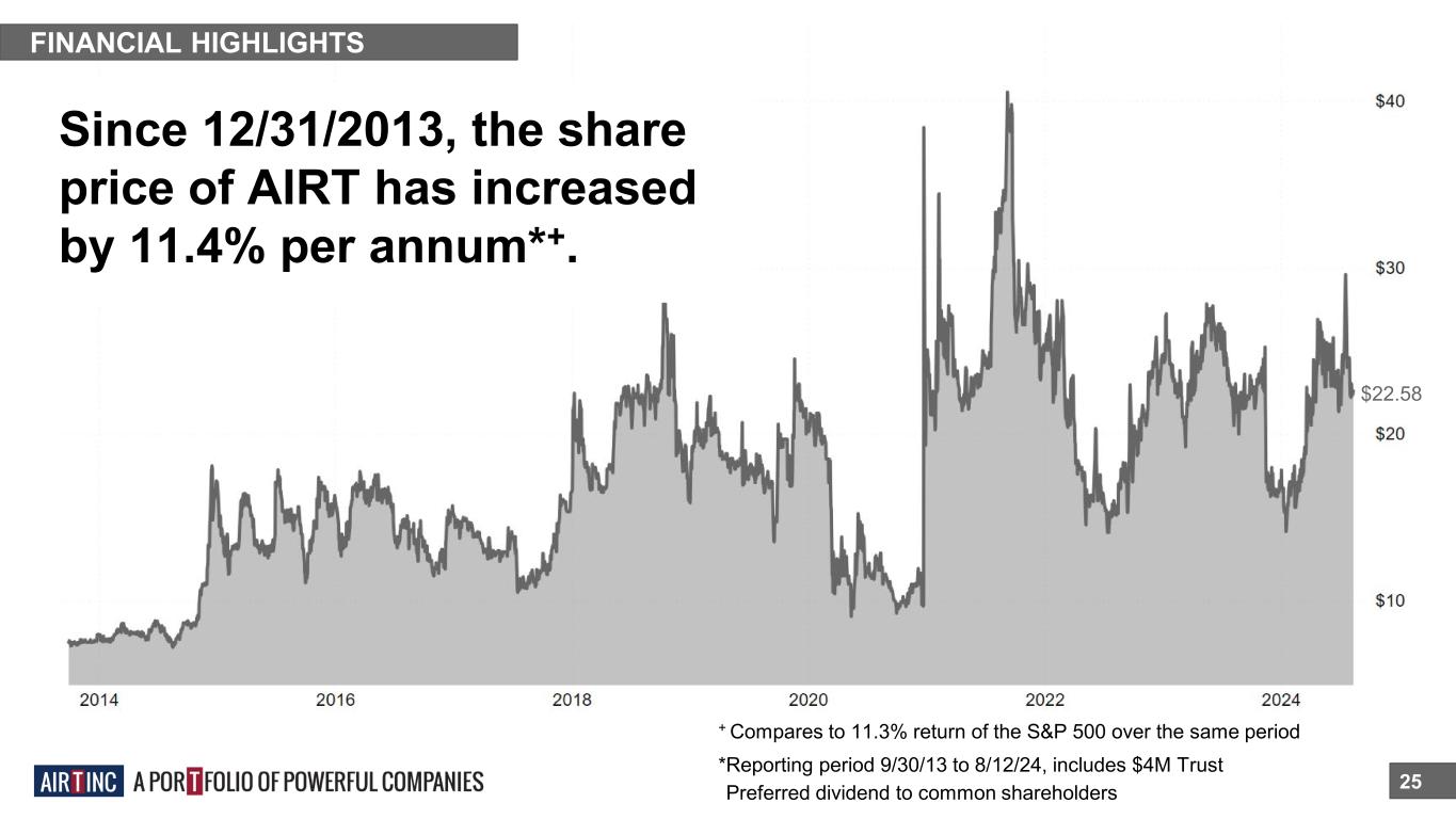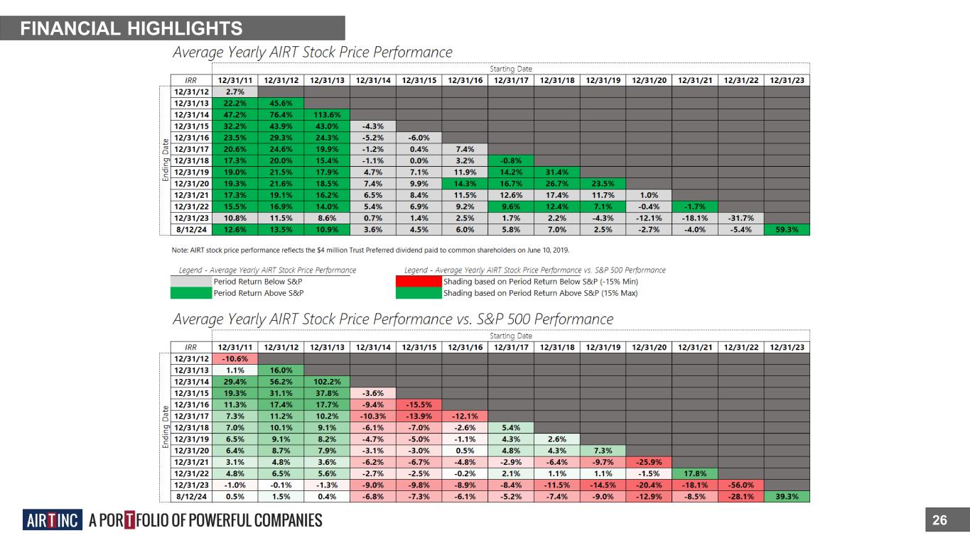 FINANCIAL HIGHLIGHTS 25 Since 12/31/2013, the share price of AIRT has increased by 11.4% per annum*+. *Reporting period 9/30/13 to 8/12/24, includes $4M Trust *Preferred dividend to common shareholders + Compares to 11.3% return of the S&P 500 over the same period $22.58