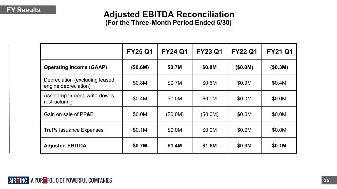 Adjusted EBITDA Reconciliation 34 FY Results *Includes one-time ERC credit of $9.1M (For the Twelve-Month Period Ended 3/31) FY24 FY23 FY22 FY21 FY20 Operating Income (GAAP) $1.3M ($4.4M) $8.8M* ($9.2M) 7.3M Depreciation (excluding leased engine depreciation) $2.8M $2.5M $1.6M $1.2M $1.3M Asset Impairment, write-downs, restructuring $1.2M $7.8M $0.8M $6.6M $0.0M Gain on sale of PP&E $0.0M $0.0M $0.0M ($0.0M) ($0.0M) TruPs Issuance Expenses $0.3M $0.1M $0.3M $0.0M $0.4M Adjusted EBITDA $5.6M $6.0M $11.4M* ($1.3M) $9.0M