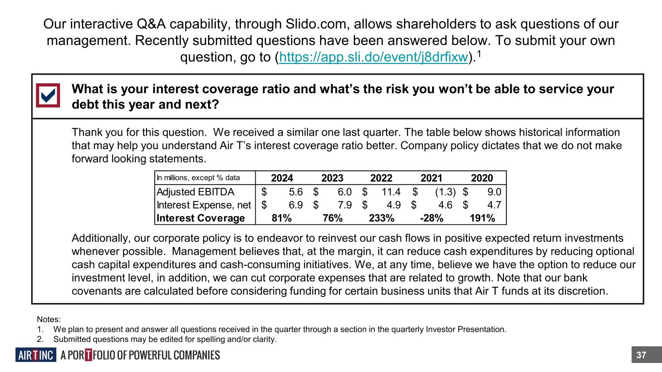 Our interactive Q&A capability, through Slido.com, allows shareholders to ask questions of our management. Recently submitted questions have been answered below. To submit your own question, go to (https://app.sli.do/event/j8drfixw).1 37 What is your interest coverage ratio and what’s the risk you won’t be able to service your debt this year and next? Thank you for this question. We received a similar one last quarter. The table below shows historical information that may help you understand Air T’s interest coverage ratio better. Company policy dictates that we do not make forward looking statements. Additionally, our corporate policy is to endeavor to reinvest our cash flows in positive expected return investments whenever possible. Management believes that, at the margin, it can reduce cash expenditures by reducing optional cash capital expenditures and cash-consuming initiatives. We, at any time, believe we have the option to reduce our investment level, in addition, we can cut corporate expenses that are related to growth. Note that our bank covenants are calculated before considering funding for certain business units that Air T funds at its discretion. Notes: 1. We plan to present and answer all questions received in the quarter through a section in the quarterly Investor Presentation. 2. Submitted questions may be edited for spelling and/or clarity. In millions, except % data 2024 2023 2022 2021 2020 Adjusted EBITDA 5.6$ 6.0$ 11.4$ (1.3)$ 9.0$ Interest Expense, net 6.9$ 7.9$ 4.9$ 4.6$ 4.7$ Interest Coverage 81% 76% 233% -28% 191%