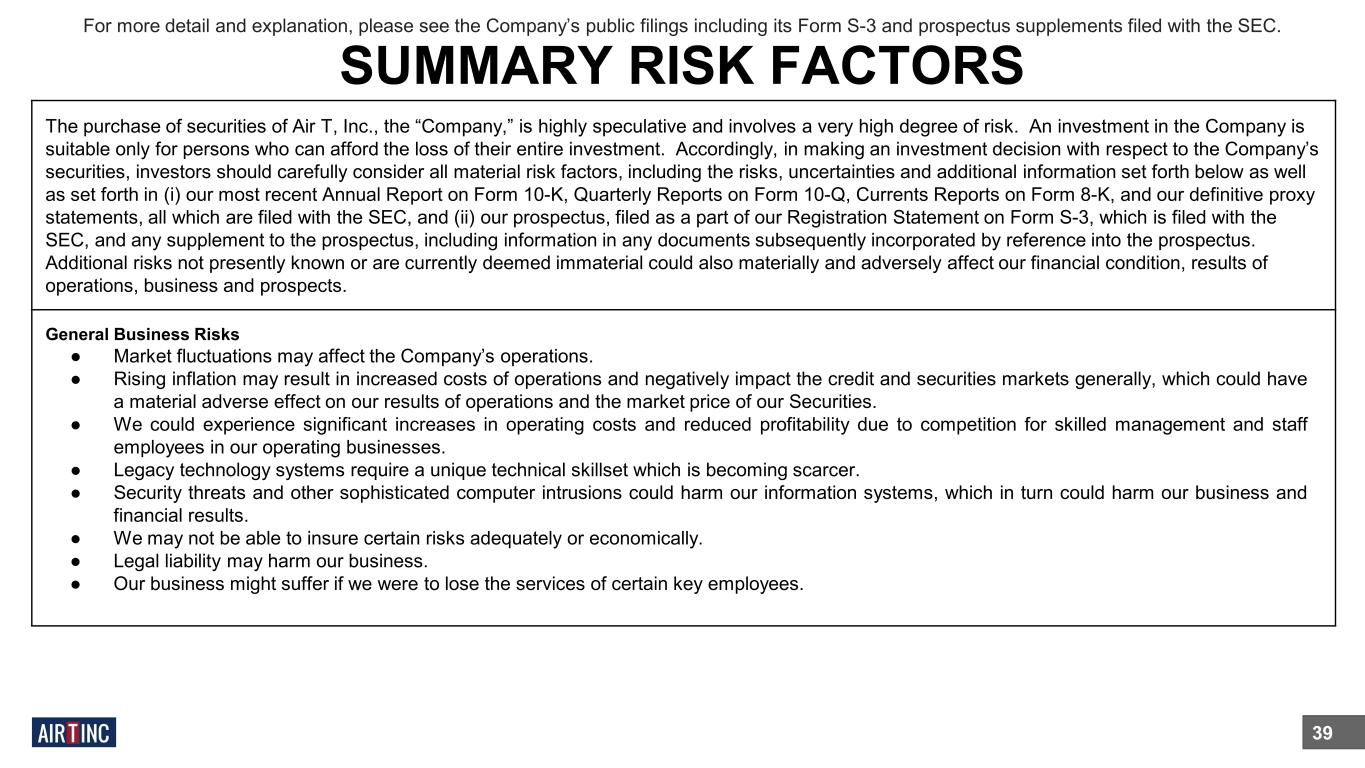SUMMARY RISK FACTORS 39 For more detail and explanation, please see the Company’s public filings including its Form S-3 and prospectus supplements filed with the SEC. The purchase of securities of Air T, Inc., the “Company,” is highly speculative and involves a very high degree of risk. An investment in the Company is suitable only for persons who can afford the loss of their entire investment. Accordingly, in making an investment decision with respect to the Company’s securities, investors should carefully consider all material risk factors, including the risks, uncertainties and additional information set forth below as well as set forth in (i) our most recent Annual Report on Form 10-K, Quarterly Reports on Form 10-Q, Currents Reports on Form 8-K, and our definitive proxy statements, all which are filed with the SEC, and (ii) our prospectus, filed as a part of our Registration Statement on Form S-3, which is filed with the SEC, and any supplement to the prospectus, including information in any documents subsequently incorporated by reference into the prospectus. Additional risks not presently known or are currently deemed immaterial could also materially and adversely affect our financial condition, results of operations, business and prospects. General Business Risks ● Market fluctuations may affect the Company’s operations. ● Rising inflation may result in increased costs of operations and negatively impact the credit and securities markets generally, which could have a material adverse effect on our results of operations and the market price of our Securities. ● We could experience significant increases in operating costs and reduced profitability due to competition for skilled management and staff employees in our operating businesses. ● Legacy technology systems require a unique technical skillset which is becoming scarcer. ● Security threats and other sophisticated computer intrusions could harm our information systems, which in turn could harm our business and financial results. ● We may not be able to insure certain risks adequately or economically. ● Legal liability may harm our business. ● Our business might suffer if we were to lose the services of certain key employees.