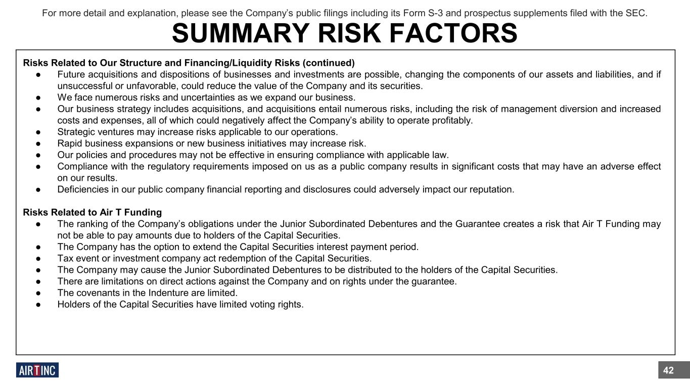 Risks Related to Our Structure and Financing/Liquidity Risks (continued) ● Future acquisitions and dispositions of businesses and investments are possible, changing the components of our assets and liabilities, and if unsuccessful or unfavorable, could reduce the value of the Company and its securities. ● We face numerous risks and uncertainties as we expand our business. ● Our business strategy includes acquisitions, and acquisitions entail numerous risks, including the risk of management diversion and increased costs and expenses, all of which could negatively affect the Company’s ability to operate profitably. ● Strategic ventures may increase risks applicable to our operations. ● Rapid business expansions or new business initiatives may increase risk. ● Our policies and procedures may not be effective in ensuring compliance with applicable law. ● Compliance with the regulatory requirements imposed on us as a public company results in significant costs that may have an adverse effect on our results. ● Deficiencies in our public company financial reporting and disclosures could adversely impact our reputation. Risks Related to Air T Funding ● The ranking of the Company’s obligations under the Junior Subordinated Debentures and the Guarantee creates a risk that Air T Funding may not be able to pay amounts due to holders of the Capital Securities. ● The Company has the option to extend the Capital Securities interest payment period. ● Tax event or investment company act redemption of the Capital Securities. ● The Company may cause the Junior Subordinated Debentures to be distributed to the holders of the Capital Securities. ● There are limitations on direct actions against the Company and on rights under the guarantee. ● The covenants in the Indenture are limited. ● Holders of the Capital Securities have limited voting rights. 42 For more detail and explanation, please see the Company’s public filings including its Form S-3 and prospectus supplements filed with the SEC. SUMMARY RISK FACTORS
