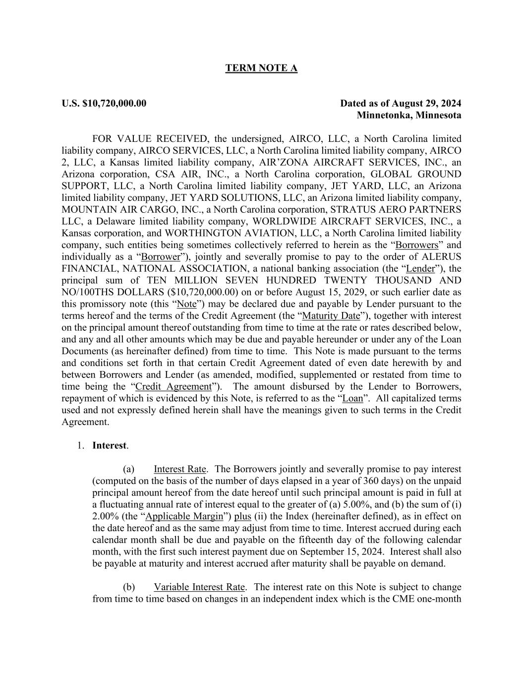TERM NOTE A U.S. $10,720,000.00 Dated as of August 29, 2024 Minnetonka, Minnesota FOR VALUE RECEIVED, the undersigned, AIRCO, LLC, a North Carolina limited liability company, AIRCO SERVICES, LLC, a North Carolina limited liability company, AIRCO 2, LLC, a Kansas limited liability company, AIR’ZONA AIRCRAFT SERVICES, INC., an Arizona corporation, CSA AIR, INC., a North Carolina corporation, GLOBAL GROUND SUPPORT, LLC, a North Carolina limited liability company, JET YARD, LLC, an Arizona limited liability company, JET YARD SOLUTIONS, LLC, an Arizona limited liability company, MOUNTAIN AIR CARGO, INC., a North Carolina corporation, STRATUS AERO PARTNERS LLC, a Delaware limited liability company, WORLDWIDE AIRCRAFT SERVICES, INC., a Kansas corporation, and WORTHINGTON AVIATION, LLC, a North Carolina limited liability company, such entities being sometimes collectively referred to herein as the “Borrowers” and individually as a “Borrower”), jointly and severally promise to pay to the order of ALERUS FINANCIAL, NATIONAL ASSOCIATION, a national banking association (the “Lender”), the principal sum of TEN MILLION SEVEN HUNDRED TWENTY THOUSAND AND NO/100THS DOLLARS ($10,720,000.00) on or before August 15, 2029, or such earlier date as this promissory note (this “Note”) may be declared due and payable by Lender pursuant to the terms hereof and the terms of the Credit Agreement (the “Maturity Date”), together with interest on the principal amount thereof outstanding from time to time at the rate or rates described below, and any and all other amounts which may be due and payable hereunder or under any of the Loan Documents (as hereinafter defined) from time to time. This Note is made pursuant to the terms and conditions set forth in that certain Credit Agreement dated of even date herewith by and between Borrowers and Lender (as amended, modified, supplemented or restated from time to time being the “Credit Agreement”). The amount disbursed by the Lender to Borrowers, repayment of which is evidenced by this Note, is referred to as the “Loan”. All capitalized terms used and not expressly defined herein shall have the meanings given to such terms in the Credit Agreement. 1. Interest. (a) Interest Rate. The Borrowers jointly and severally promise to pay interest (computed on the basis of the number of days elapsed in a year of 360 days) on the unpaid principal amount hereof from the date hereof until such principal amount is paid in full at a fluctuating annual rate of interest equal to the greater of (a) 5.00%, and (b) the sum of (i) 2.00% (the “Applicable Margin”) plus (ii) the Index (hereinafter defined), as in effect on the date hereof and as the same may adjust from time to time. Interest accrued during each calendar month shall be due and payable on the fifteenth day of the following calendar month, with the first such interest payment due on September 15, 2024. Interest shall also be payable at maturity and interest accrued after maturity shall be payable on demand. (b) Variable Interest Rate. The interest rate on this Note is subject to change from time to time based on changes in an independent index which is the CME one-month