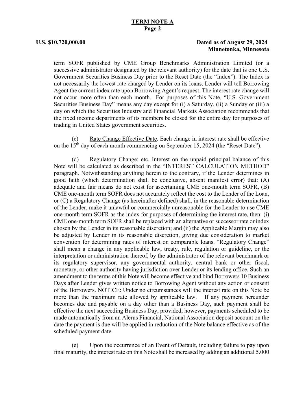 TERM NOTE A Page 2 U.S. $10,720,000.00 Dated as of August 29, 2024 Minnetonka, Minnesota term SOFR published by CME Group Benchmarks Administration Limited (or a successive administrator designated by the relevant authority) for the date that is one U.S. Government Securities Business Day prior to the Reset Date (the “Index”). The Index is not necessarily the lowest rate charged by Lender on its loans. Lender will tell Borrowing Agent the current index rate upon Borrowing Agent’s request. The interest rate change will not occur more often than each month. For purposes of this Note, “U.S. Government Securities Business Day” means any day except for (i) a Saturday, (ii) a Sunday or (iii) a day on which the Securities Industry and Financial Markets Association recommends that the fixed income departments of its members be closed for the entire day for purposes of trading in United States government securities. (c) Rate Change Effective Date. Each change in interest rate shall be effective on the 15th day of each month commencing on September 15, 2024 (the “Reset Date”). (d) Regulatory Change; etc. Interest on the unpaid principal balance of this Note will be calculated as described in the “INTEREST CALCULATION METHOD” paragraph. Notwithstanding anything herein to the contrary, if the Lender determines in good faith (which determination shall be conclusive, absent manifest error) that: (A) adequate and fair means do not exist for ascertaining CME one-month term SOFR, (B) CME one-month term SOFR does not accurately reflect the cost to the Lender of the Loan, or (C) a Regulatory Change (as hereinafter defined) shall, in the reasonable determination of the Lender, make it unlawful or commercially unreasonable for the Lender to use CME one-month term SOFR as the index for purposes of determining the interest rate, then: (i) CME one-month term SOFR shall be replaced with an alternative or successor rate or index chosen by the Lender in its reasonable discretion; and (ii) the Applicable Margin may also be adjusted by Lender in its reasonable discretion, giving due consideration to market convention for determining rates of interest on comparable loans. “Regulatory Change” shall mean a change in any applicable law, treaty, rule, regulation or guideline, or the interpretation or administration thereof, by the administrator of the relevant benchmark or its regulatory supervisor, any governmental authority, central bank or other fiscal, monetary, or other authority having jurisdiction over Lender or its lending office. Such an amendment to the terms of this Note will become effective and bind Borrowers 10 Business Days after Lender gives written notice to Borrowing Agent without any action or consent of the Borrowers. NOTICE: Under no circumstances will the interest rate on this Note be more than the maximum rate allowed by applicable law. If any payment hereunder becomes due and payable on a day other than a Business Day, such payment shall be effective the next succeeding Business Day, provided, however, payments scheduled to be made automatically from an Alerus Financial, National Association deposit account on the date the payment is due will be applied in reduction of the Note balance effective as of the scheduled payment date. (e) Upon the occurrence of an Event of Default, including failure to pay upon final maturity, the interest rate on this Note shall be increased by adding an additional 5.000