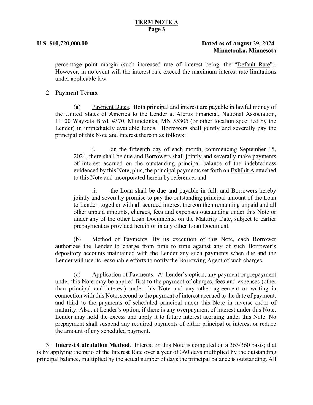TERM NOTE A Page 3 U.S. $10,720,000.00 Dated as of August 29, 2024 Minnetonka, Minnesota percentage point margin (such increased rate of interest being, the “Default Rate”). However, in no event will the interest rate exceed the maximum interest rate limitations under applicable law. 2. Payment Terms. (a) Payment Dates. Both principal and interest are payable in lawful money of the United States of America to the Lender at Alerus Financial, National Association, 11100 Wayzata Blvd, #570, Minnetonka, MN 55305 (or other location specified by the Lender) in immediately available funds. Borrowers shall jointly and severally pay the principal of this Note and interest thereon as follows: i. on the fifteenth day of each month, commencing September 15, 2024, there shall be due and Borrowers shall jointly and severally make payments of interest accrued on the outstanding principal balance of the indebtedness evidenced by this Note, plus, the principal payments set forth on Exhibit A attached to this Note and incorporated herein by reference; and ii. the Loan shall be due and payable in full, and Borrowers hereby jointly and severally promise to pay the outstanding principal amount of the Loan to Lender, together with all accrued interest thereon then remaining unpaid and all other unpaid amounts, charges, fees and expenses outstanding under this Note or under any of the other Loan Documents, on the Maturity Date, subject to earlier prepayment as provided herein or in any other Loan Document. (b) Method of Payments. By its execution of this Note, each Borrower authorizes the Lender to charge from time to time against any of such Borrower’s depository accounts maintained with the Lender any such payments when due and the Lender will use its reasonable efforts to notify the Borrowing Agent of such charges. (c) Application of Payments. At Lender’s option, any payment or prepayment under this Note may be applied first to the payment of charges, fees and expenses (other than principal and interest) under this Note and any other agreement or writing in connection with this Note, second to the payment of interest accrued to the date of payment, and third to the payments of scheduled principal under this Note in inverse order of maturity. Also, at Lender’s option, if there is any overpayment of interest under this Note, Lender may hold the excess and apply it to future interest accruing under this Note. No prepayment shall suspend any required payments of either principal or interest or reduce the amount of any scheduled payment. 3. Interest Calculation Method. Interest on this Note is computed on a 365/360 basis; that is by applying the ratio of the Interest Rate over a year of 360 days multiplied by the outstanding principal balance, multiplied by the actual number of days the principal balance is outstanding. All