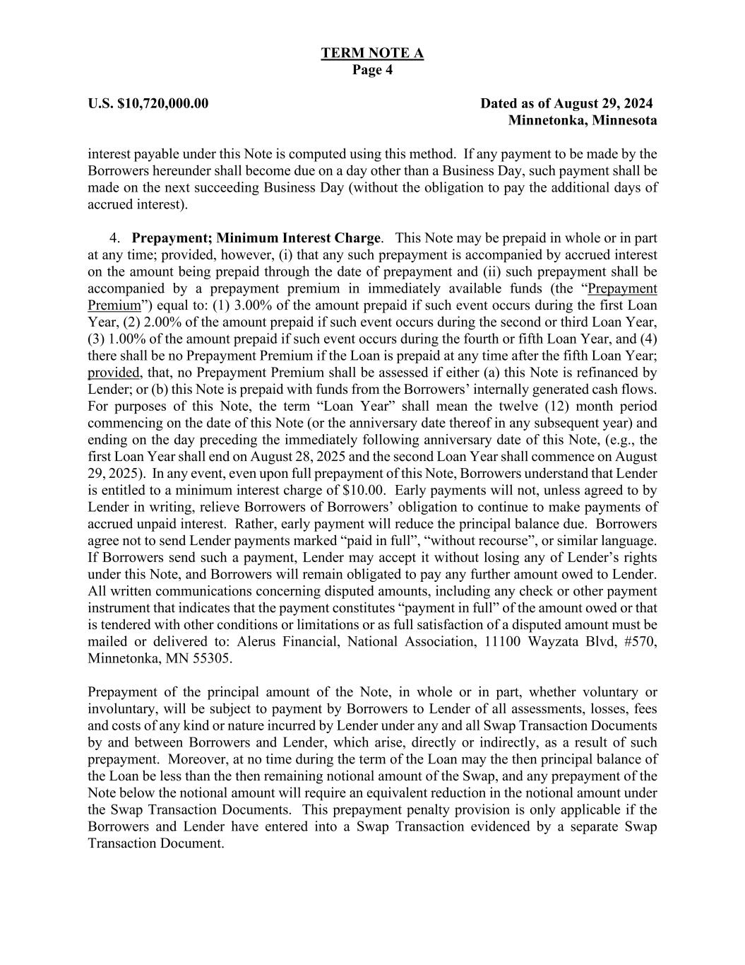 TERM NOTE A Page 4 U.S. $10,720,000.00 Dated as of August 29, 2024 Minnetonka, Minnesota interest payable under this Note is computed using this method. If any payment to be made by the Borrowers hereunder shall become due on a day other than a Business Day, such payment shall be made on the next succeeding Business Day (without the obligation to pay the additional days of accrued interest). 4. Prepayment; Minimum Interest Charge. This Note may be prepaid in whole or in part at any time; provided, however, (i) that any such prepayment is accompanied by accrued interest on the amount being prepaid through the date of prepayment and (ii) such prepayment shall be accompanied by a prepayment premium in immediately available funds (the “Prepayment Premium”) equal to: (1) 3.00% of the amount prepaid if such event occurs during the first Loan Year, (2) 2.00% of the amount prepaid if such event occurs during the second or third Loan Year, (3) 1.00% of the amount prepaid if such event occurs during the fourth or fifth Loan Year, and (4) there shall be no Prepayment Premium if the Loan is prepaid at any time after the fifth Loan Year; provided, that, no Prepayment Premium shall be assessed if either (a) this Note is refinanced by Lender; or (b) this Note is prepaid with funds from the Borrowers’ internally generated cash flows. For purposes of this Note, the term “Loan Year” shall mean the twelve (12) month period commencing on the date of this Note (or the anniversary date thereof in any subsequent year) and ending on the day preceding the immediately following anniversary date of this Note, (e.g., the first Loan Year shall end on August 28, 2025 and the second Loan Year shall commence on August 29, 2025). In any event, even upon full prepayment of this Note, Borrowers understand that Lender is entitled to a minimum interest charge of $10.00. Early payments will not, unless agreed to by Lender in writing, relieve Borrowers of Borrowers’ obligation to continue to make payments of accrued unpaid interest. Rather, early payment will reduce the principal balance due. Borrowers agree not to send Lender payments marked “paid in full”, “without recourse”, or similar language. If Borrowers send such a payment, Lender may accept it without losing any of Lender’s rights under this Note, and Borrowers will remain obligated to pay any further amount owed to Lender. All written communications concerning disputed amounts, including any check or other payment instrument that indicates that the payment constitutes “payment in full” of the amount owed or that is tendered with other conditions or limitations or as full satisfaction of a disputed amount must be mailed or delivered to: Alerus Financial, National Association, 11100 Wayzata Blvd, #570, Minnetonka, MN 55305. Prepayment of the principal amount of the Note, in whole or in part, whether voluntary or involuntary, will be subject to payment by Borrowers to Lender of all assessments, losses, fees and costs of any kind or nature incurred by Lender under any and all Swap Transaction Documents by and between Borrowers and Lender, which arise, directly or indirectly, as a result of such prepayment. Moreover, at no time during the term of the Loan may the then principal balance of the Loan be less than the then remaining notional amount of the Swap, and any prepayment of the Note below the notional amount will require an equivalent reduction in the notional amount under the Swap Transaction Documents. This prepayment penalty provision is only applicable if the Borrowers and Lender have entered into a Swap Transaction evidenced by a separate Swap Transaction Document.