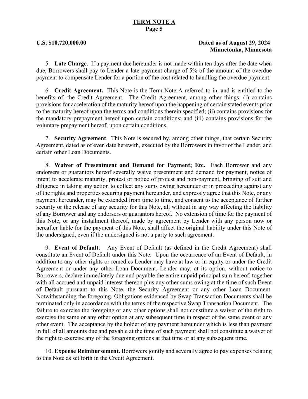 TERM NOTE A Page 5 U.S. $10,720,000.00 Dated as of August 29, 2024 Minnetonka, Minnesota 5. Late Charge. If a payment due hereunder is not made within ten days after the date when due, Borrowers shall pay to Lender a late payment charge of 5% of the amount of the overdue payment to compensate Lender for a portion of the cost related to handling the overdue payment. 6. Credit Agreement. This Note is the Term Note A referred to in, and is entitled to the benefits of, the Credit Agreement. The Credit Agreement, among other things, (i) contains provisions for acceleration of the maturity hereof upon the happening of certain stated events prior to the maturity hereof upon the terms and conditions therein specified; (ii) contains provisions for the mandatory prepayment hereof upon certain conditions; and (iii) contains provisions for the voluntary prepayment hereof, upon certain conditions. 7. Security Agreement. This Note is secured by, among other things, that certain Security Agreement, dated as of even date herewith, executed by the Borrowers in favor of the Lender, and certain other Loan Documents. 8. Waiver of Presentment and Demand for Payment; Etc. Each Borrower and any endorsers or guarantors hereof severally waive presentment and demand for payment, notice of intent to accelerate maturity, protest or notice of protest and non-payment, bringing of suit and diligence in taking any action to collect any sums owing hereunder or in proceeding against any of the rights and properties securing payment hereunder, and expressly agree that this Note, or any payment hereunder, may be extended from time to time, and consent to the acceptance of further security or the release of any security for this Note, all without in any way affecting the liability of any Borrower and any endorsers or guarantors hereof. No extension of time for the payment of this Note, or any installment thereof, made by agreement by Lender with any person now or hereafter liable for the payment of this Note, shall affect the original liability under this Note of the undersigned, even if the undersigned is not a party to such agreement. 9. Event of Default. Any Event of Default (as defined in the Credit Agreement) shall constitute an Event of Default under this Note. Upon the occurrence of an Event of Default, in addition to any other rights or remedies Lender may have at law or in equity or under the Credit Agreement or under any other Loan Document, Lender may, at its option, without notice to Borrowers, declare immediately due and payable the entire unpaid principal sum hereof, together with all accrued and unpaid interest thereon plus any other sums owing at the time of such Event of Default pursuant to this Note, the Security Agreement or any other Loan Document. Notwithstanding the foregoing, Obligations evidenced by Swap Transaction Documents shall be terminated only in accordance with the terms of the respective Swap Transaction Document. The failure to exercise the foregoing or any other options shall not constitute a waiver of the right to exercise the same or any other option at any subsequent time in respect of the same event or any other event. The acceptance by the holder of any payment hereunder which is less than payment in full of all amounts due and payable at the time of such payment shall not constitute a waiver of the right to exercise any of the foregoing options at that time or at any subsequent time. 10. Expense Reimbursement. Borrowers jointly and severally agree to pay expenses relating to this Note as set forth in the Credit Agreement.