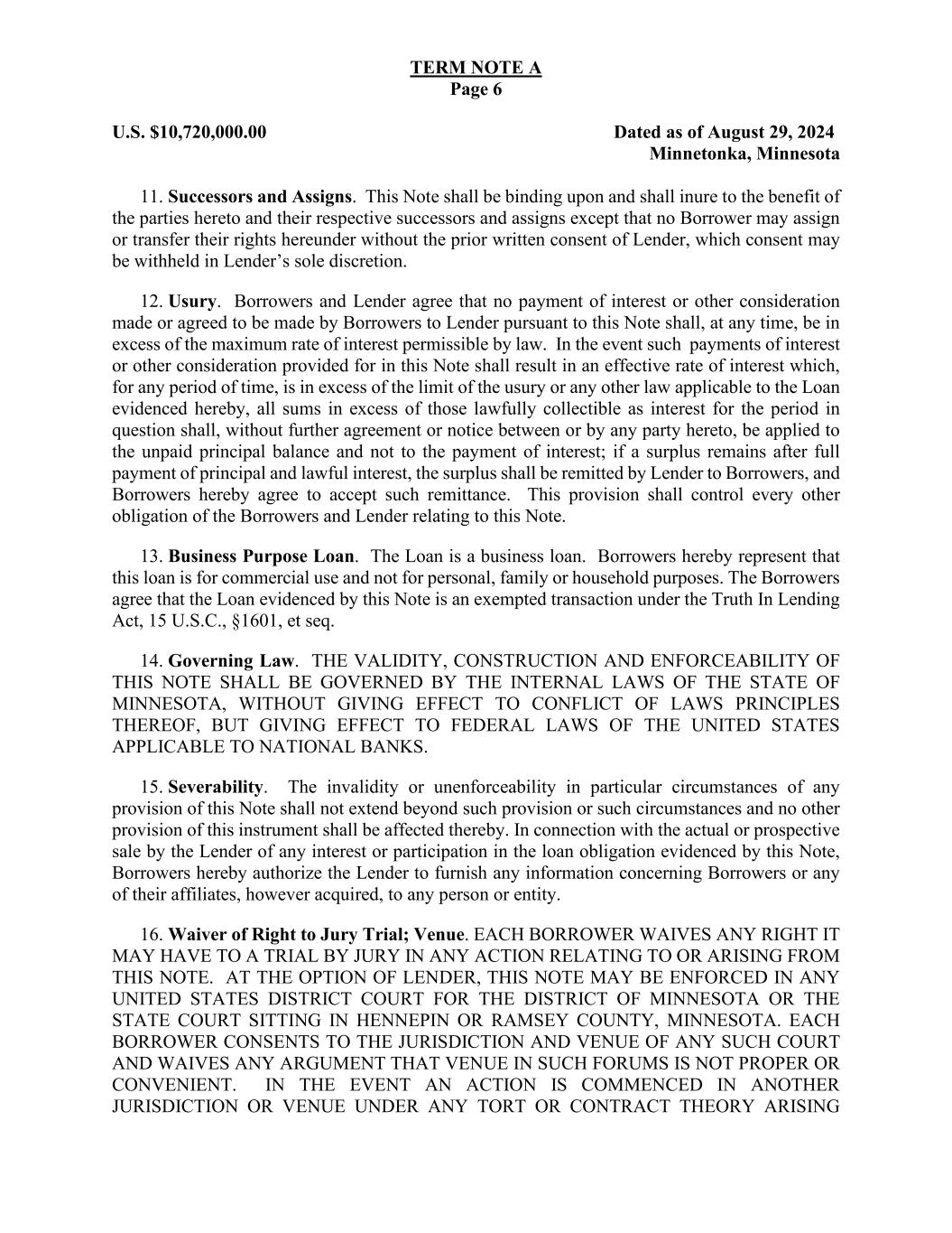 TERM NOTE A Page 6 U.S. $10,720,000.00 Dated as of August 29, 2024 Minnetonka, Minnesota 11. Successors and Assigns. This Note shall be binding upon and shall inure to the benefit of the parties hereto and their respective successors and assigns except that no Borrower may assign or transfer their rights hereunder without the prior written consent of Lender, which consent may be withheld in Lender’s sole discretion. 12. Usury. Borrowers and Lender agree that no payment of interest or other consideration made or agreed to be made by Borrowers to Lender pursuant to this Note shall, at any time, be in excess of the maximum rate of interest permissible by law. In the event such payments of interest or other consideration provided for in this Note shall result in an effective rate of interest which, for any period of time, is in excess of the limit of the usury or any other law applicable to the Loan evidenced hereby, all sums in excess of those lawfully collectible as interest for the period in question shall, without further agreement or notice between or by any party hereto, be applied to the unpaid principal balance and not to the payment of interest; if a surplus remains after full payment of principal and lawful interest, the surplus shall be remitted by Lender to Borrowers, and Borrowers hereby agree to accept such remittance. This provision shall control every other obligation of the Borrowers and Lender relating to this Note. 13. Business Purpose Loan. The Loan is a business loan. Borrowers hereby represent that this loan is for commercial use and not for personal, family or household purposes. The Borrowers agree that the Loan evidenced by this Note is an exempted transaction under the Truth In Lending Act, 15 U.S.C., §1601, et seq. 14. Governing Law. THE VALIDITY, CONSTRUCTION AND ENFORCEABILITY OF THIS NOTE SHALL BE GOVERNED BY THE INTERNAL LAWS OF THE STATE OF MINNESOTA, WITHOUT GIVING EFFECT TO CONFLICT OF LAWS PRINCIPLES THEREOF, BUT GIVING EFFECT TO FEDERAL LAWS OF THE UNITED STATES APPLICABLE TO NATIONAL BANKS. 15. Severability. The invalidity or unenforceability in particular circumstances of any provision of this Note shall not extend beyond such provision or such circumstances and no other provision of this instrument shall be affected thereby. In connection with the actual or prospective sale by the Lender of any interest or participation in the loan obligation evidenced by this Note, Borrowers hereby authorize the Lender to furnish any information concerning Borrowers or any of their affiliates, however acquired, to any person or entity. 16. Waiver of Right to Jury Trial; Venue. EACH BORROWER WAIVES ANY RIGHT IT MAY HAVE TO A TRIAL BY JURY IN ANY ACTION RELATING TO OR ARISING FROM THIS NOTE. AT THE OPTION OF LENDER, THIS NOTE MAY BE ENFORCED IN ANY UNITED STATES DISTRICT COURT FOR THE DISTRICT OF MINNESOTA OR THE STATE COURT SITTING IN HENNEPIN OR RAMSEY COUNTY, MINNESOTA. EACH BORROWER CONSENTS TO THE JURISDICTION AND VENUE OF ANY SUCH COURT AND WAIVES ANY ARGUMENT THAT VENUE IN SUCH FORUMS IS NOT PROPER OR CONVENIENT. IN THE EVENT AN ACTION IS COMMENCED IN ANOTHER JURISDICTION OR VENUE UNDER ANY TORT OR CONTRACT THEORY ARISING